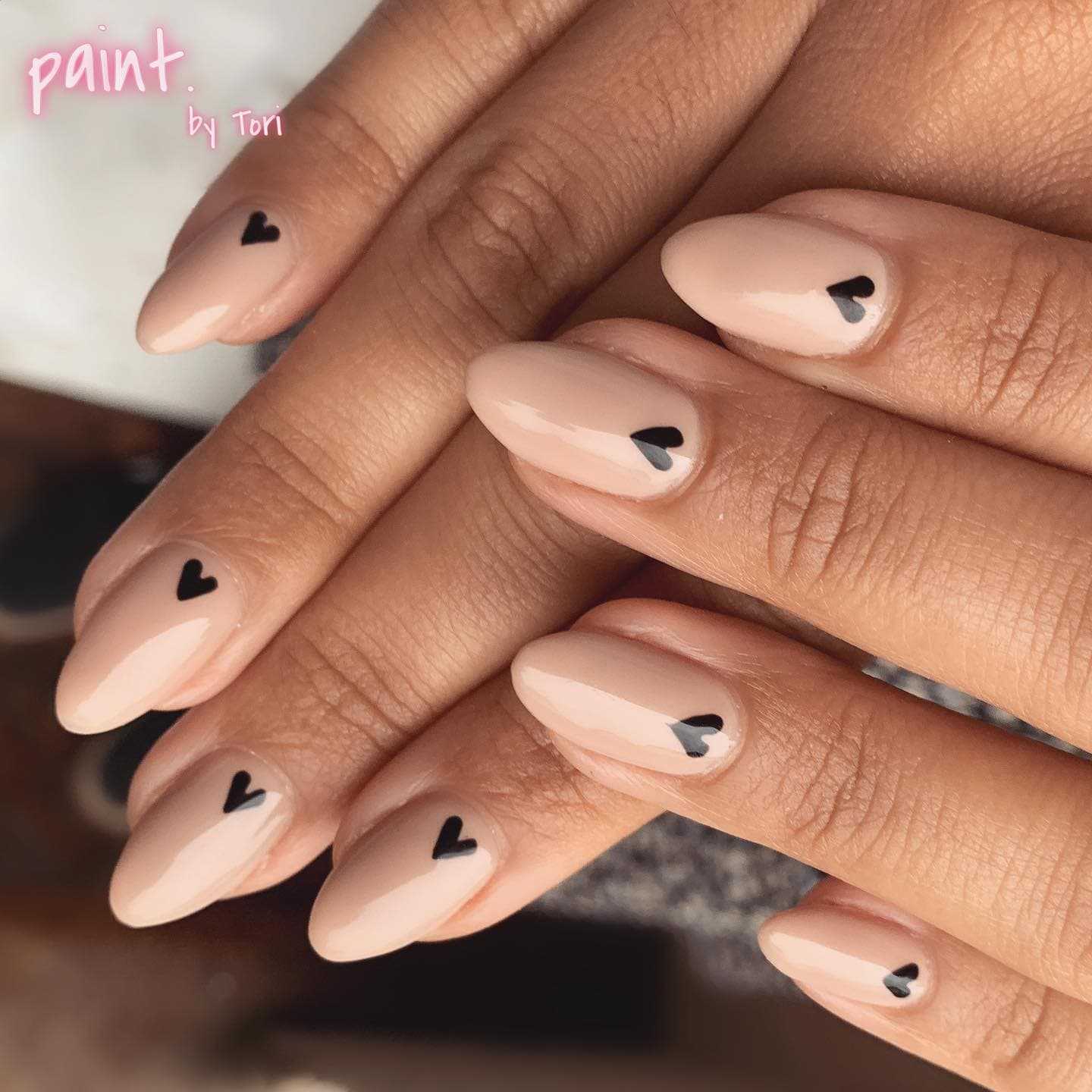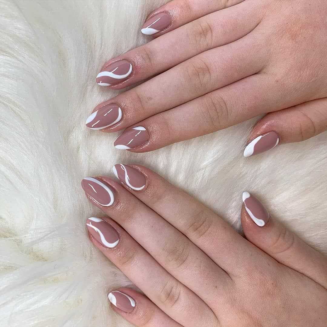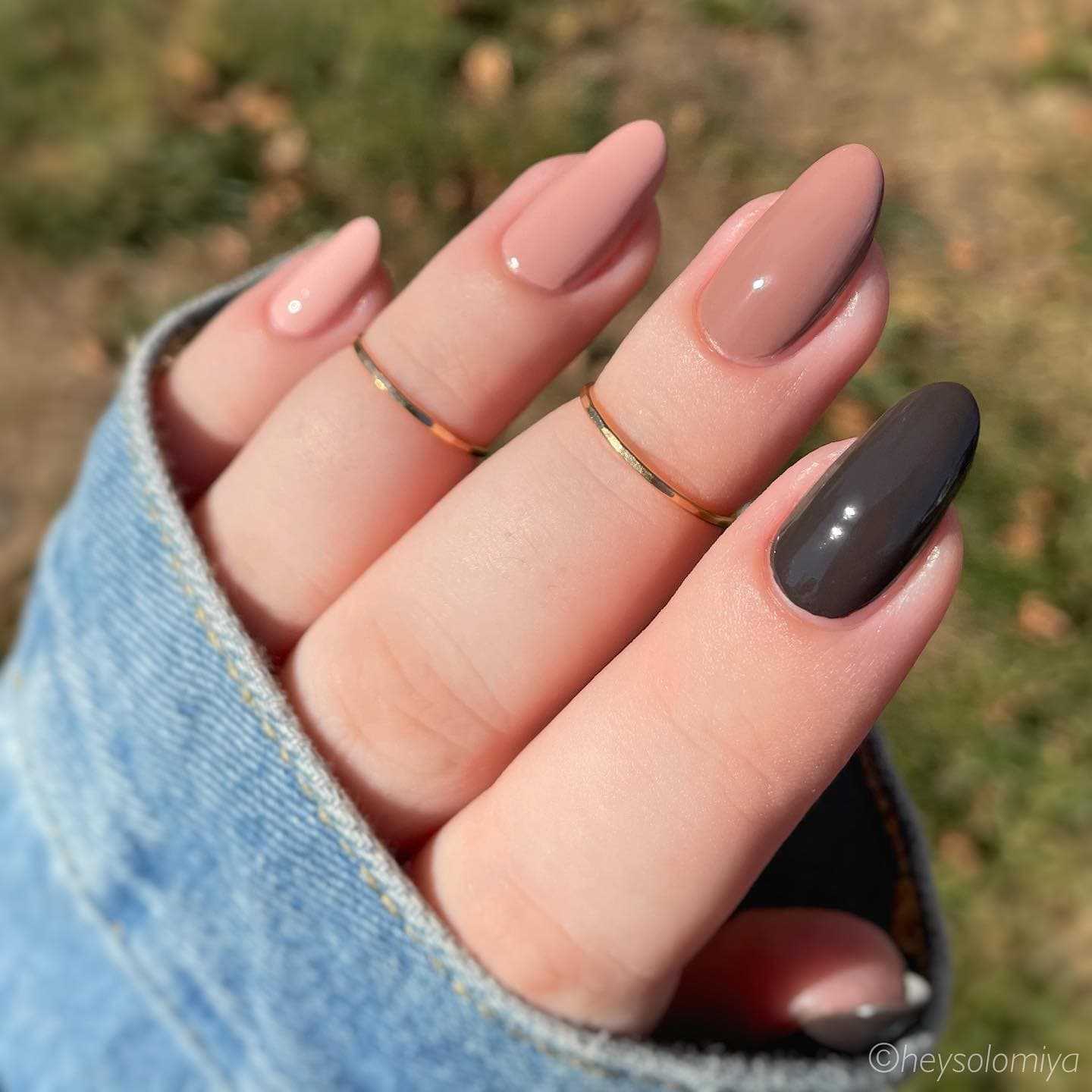Миндальный цвет относится к коричневой цветовой палитре, поэтому без проблем может гармонировать с черным оттенком. Шикарно смотрится кружевной узор на миндальном фоне, маникюр с черными полосками или абстракцией, декор с геометрией. На темном миндальном фоне красиво смотрится оттиск серебряной или золотой фольгой, декор глиттером или шиммером.