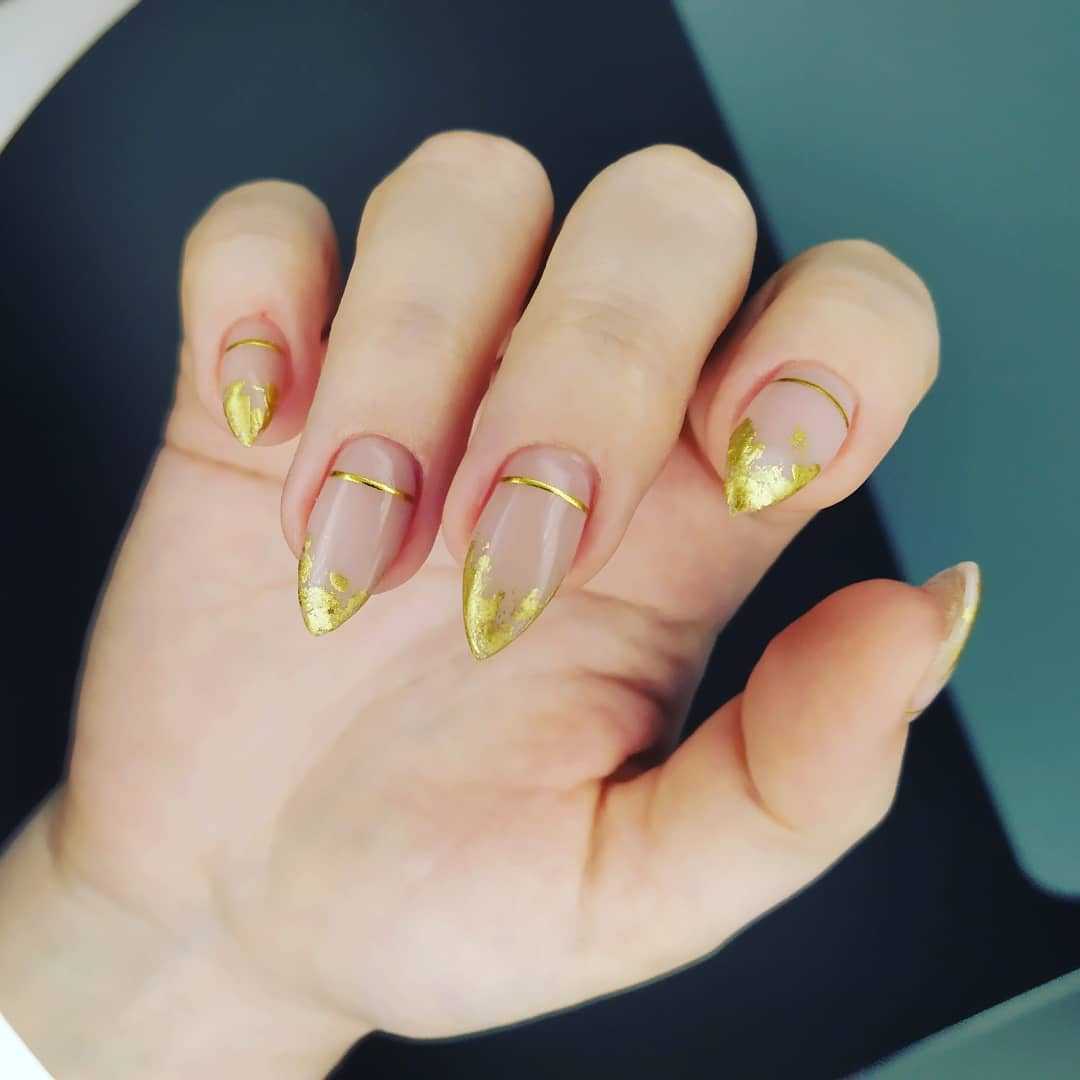 Среди новинок маникюра 2023 для ногтей миндаль следует отметить покрытие, имитирующее тонкую фольгу паталь. Многие считают такой дизайн самым красивым и неординарным. И действительно, ногти, украшенные золотистой фольгой выглядят дорого и роскошно