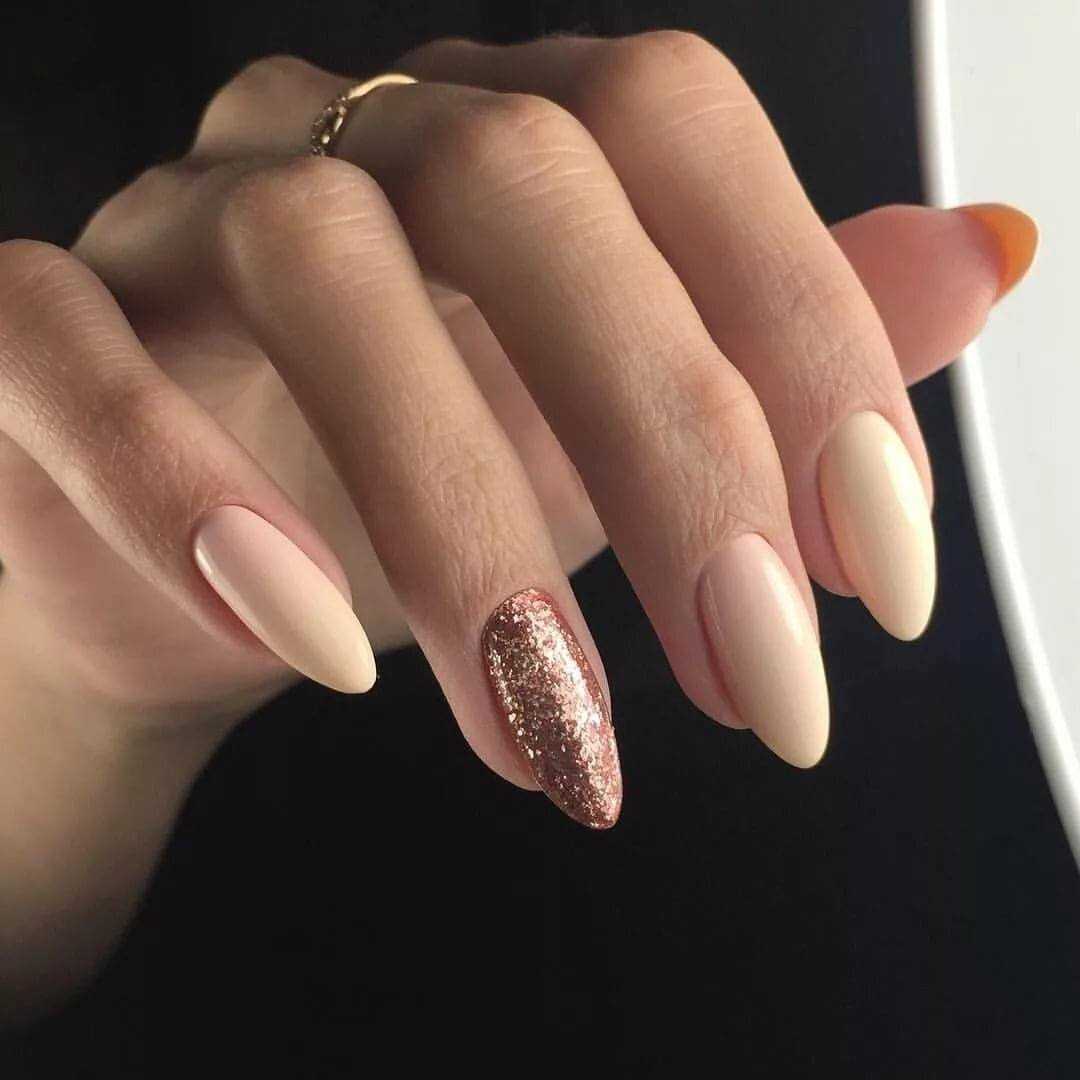 Идеальным дополнением миндального маникюра с геометрией станет серебряный или золотой глиттер. Причем золотой декор может присутствовать в повседневных образах. Дело в том, что миндальный и золотой цвет визуально схожи по колористике и идеально гармонируют в одном нейл-арте. Используйте глиттер для однотонного покрытия 1-2 ноготков на руке, например, безымянного и мизинца.