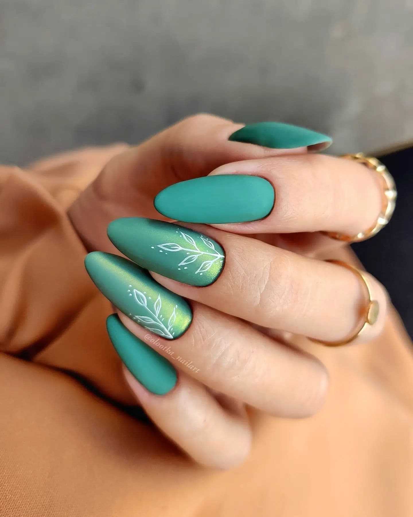 Среди всех новинок дизайна лидером будет матовый. Он очень эффектно выглядит на миндальном ногте, помогает образу приобрести изюминку и роскошь. Бархат отлично сочетается с остальными дизайнами, особенно с росписями и цветами.