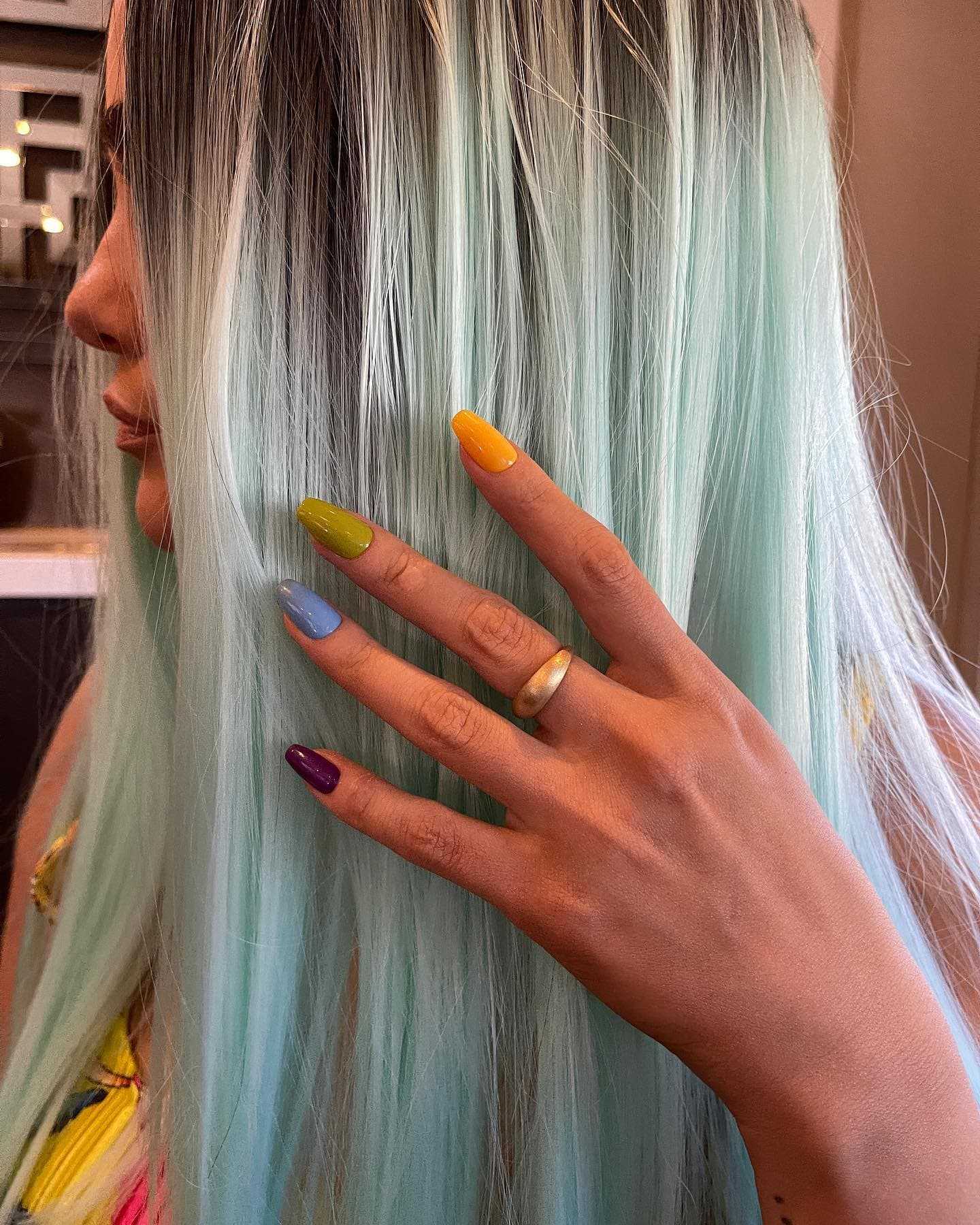 - голубой и сиреневый, а на одном ноготке – пара цветных линий.