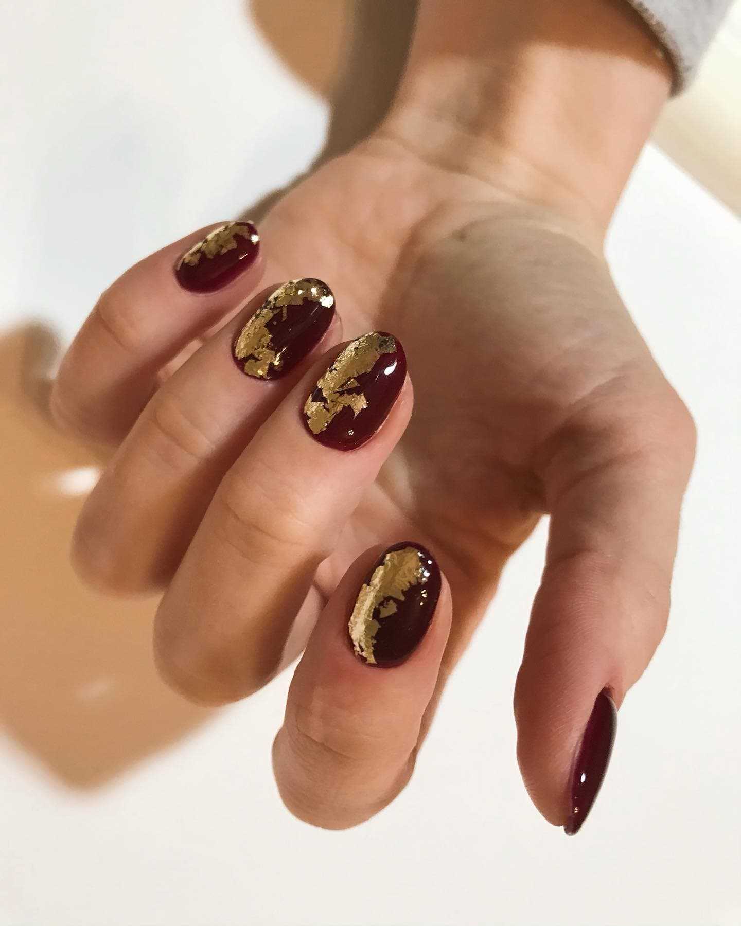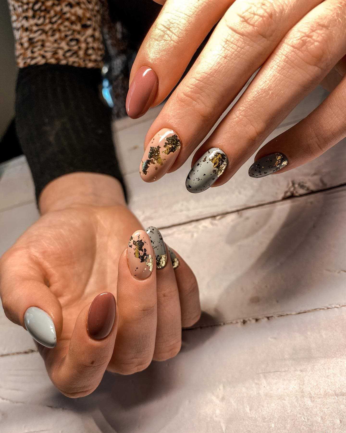 Фольга шикарно соединяется с классическим нюдом, любыми яркими тонами и даже абстракционизмом. Глиттеры, стразы и втирки также хорошо дополняют металлический слой.