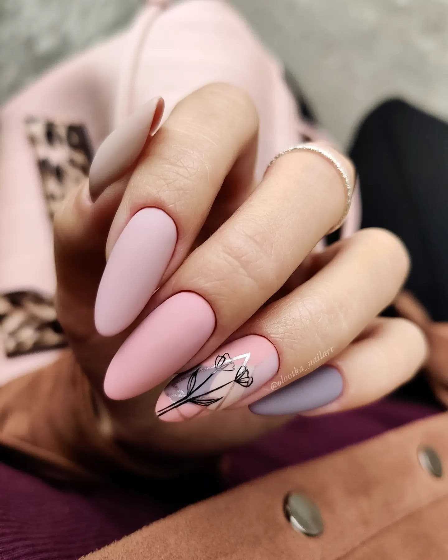 Если вы когда-нибудь выполняли маникюр с сакурой, то у вас не возникнет проблем с миндальным дизайном. Используйте для декора розовые оттенки, белый, светло-фиолетовый цвета. Это позволят создать детальный и глубокий узор с нежными цветами миндаля.