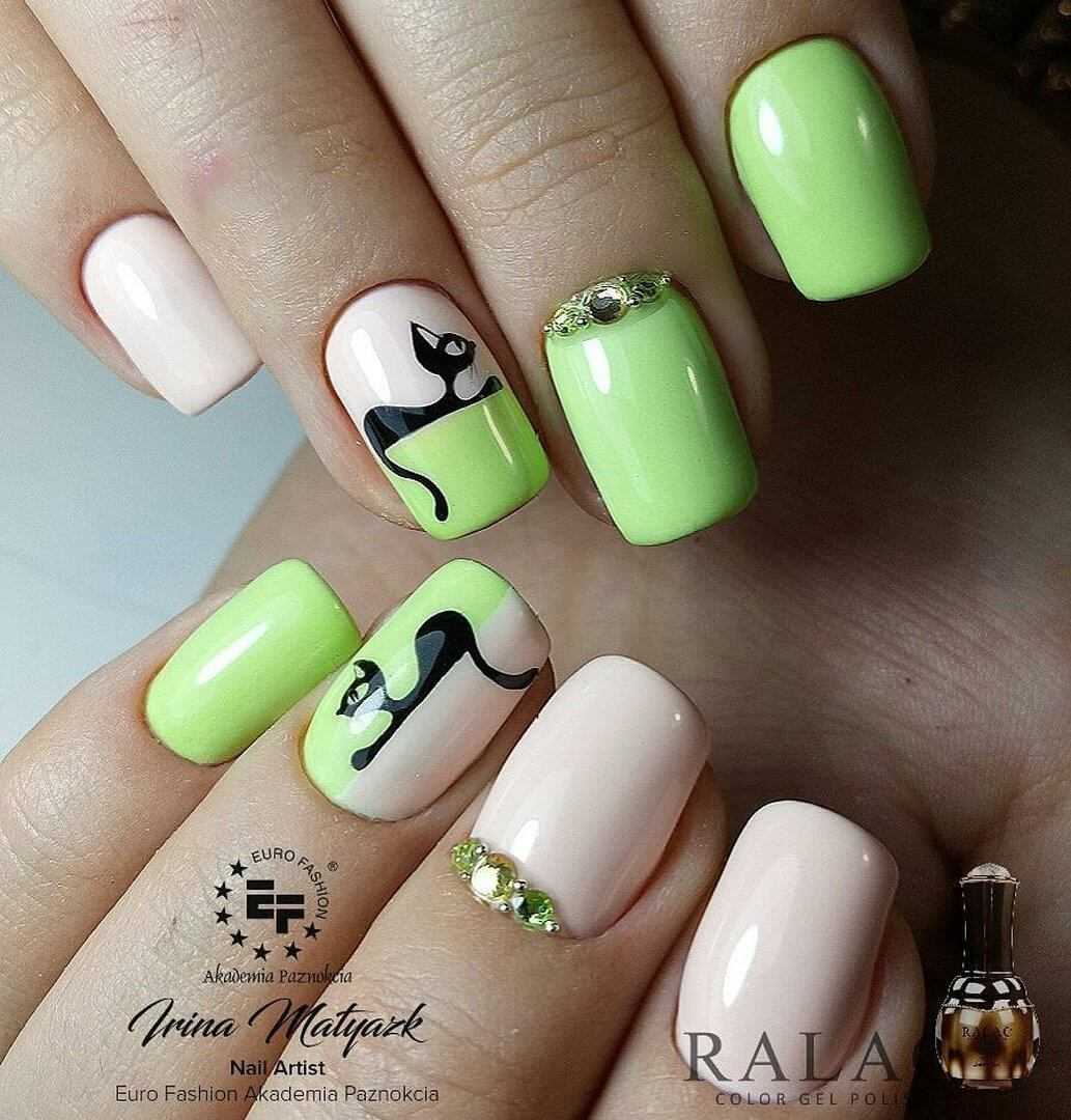 Кошки – гордые и одновременно нежные существа, которые являются домашними любимицами многих девушек. А почему бы не нарисовать грациозный силуэт прямо сейчас? Вооружитесь цветными лаками, акриловой краской зеленого и белого цвета, тонкой кистью, базой и финишным покрытием. Итак, приступим: