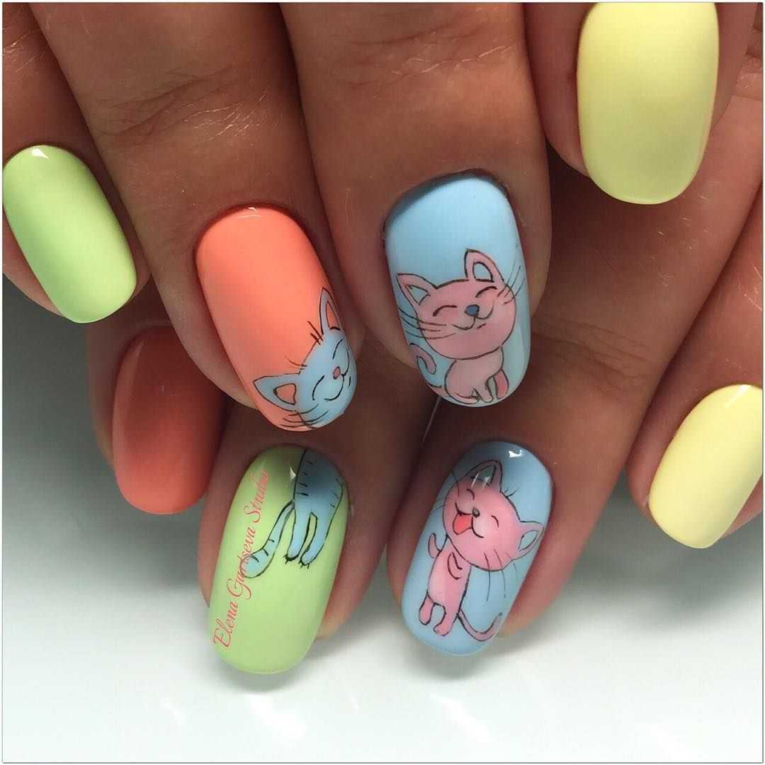 Очень интересный вариант – выполнить дизайн в стиле мультиков, придать кошкам забавный мультипликационный . Задействуйте много ярких лаков, особенно, если это касается летнего маникюра.