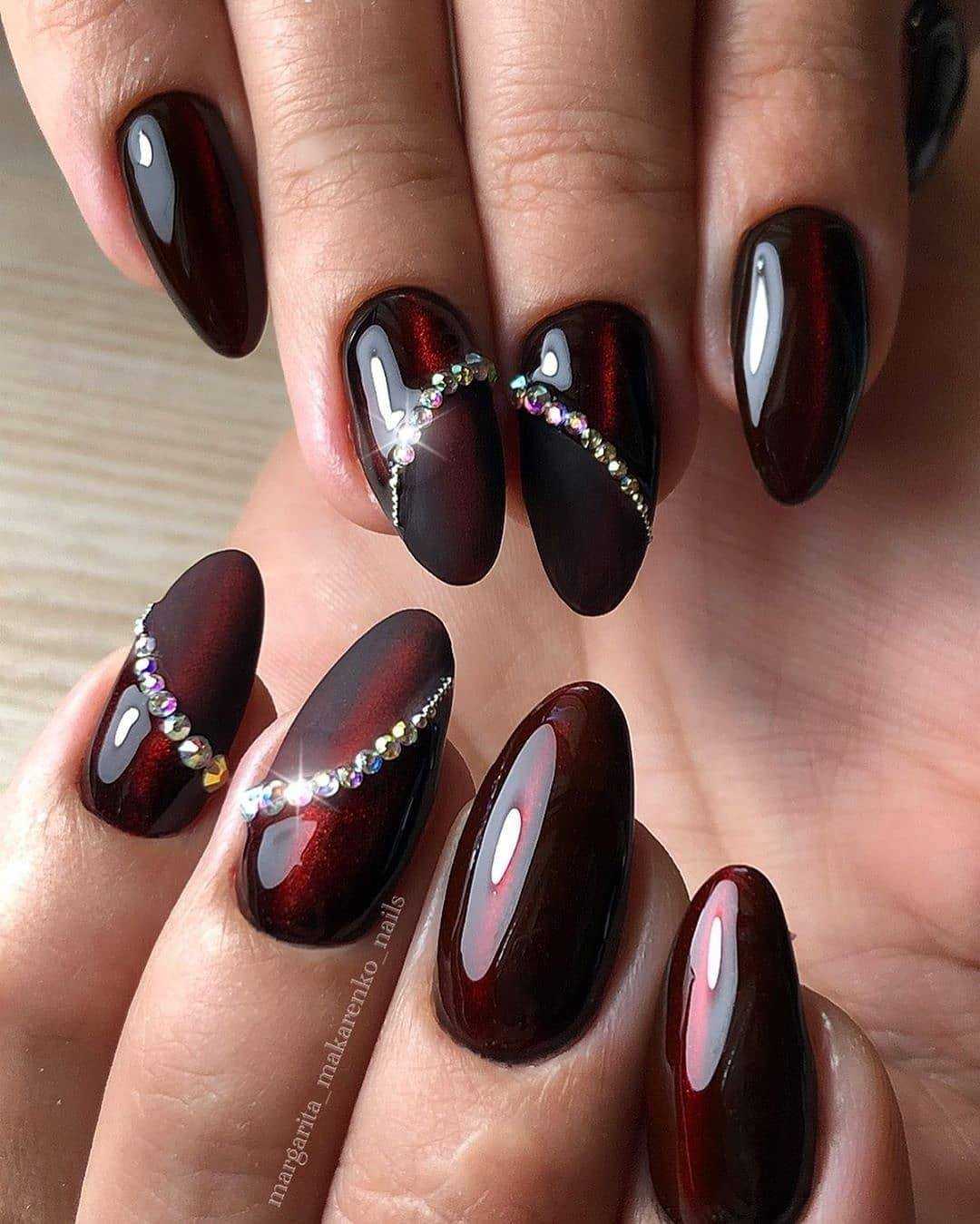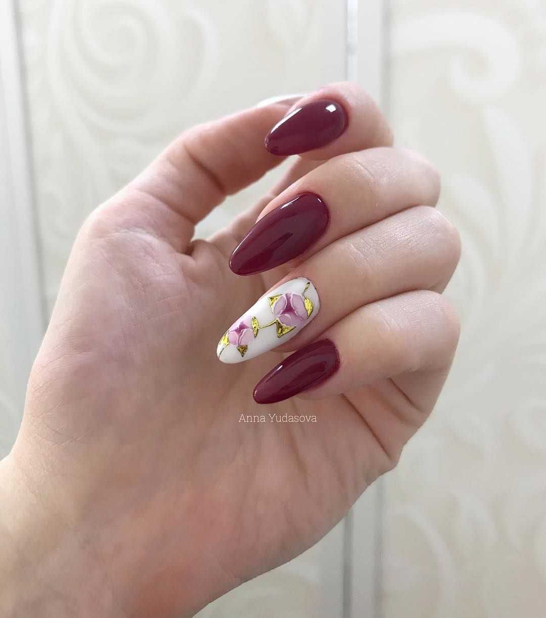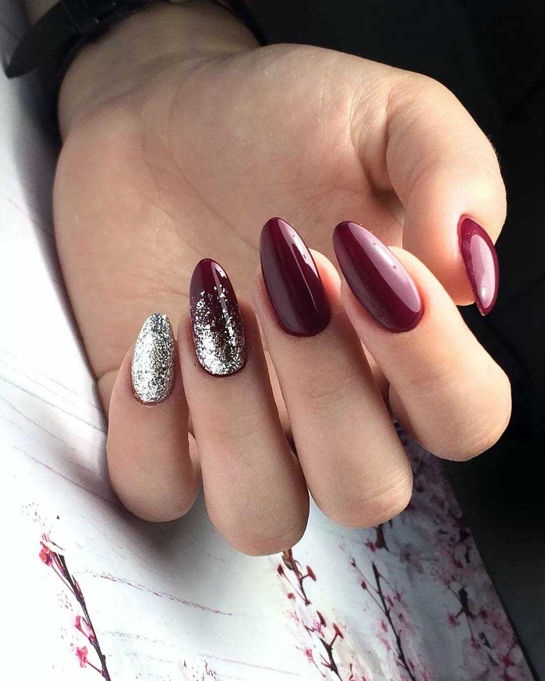 Ноготки миндалевидной формы считаются эталоном женственности и изящества, поэтому прекрасно подходят для выполнения маникюра в бордовых тонах. При этом плавность линий кончика ноготка позволяет примерять самые разные техники, начиная от классического однотонного покрытия, заканчивая абстрактными композициями и нестандартной линией френча. Блёстки можно использовать для нанесения красивых узоров, выделения частей ноготка или прорисовки деталей. Любая вариация смотрится очень привлекательно. Одно «но», проявить свои способности миндалевидная форма может только на средних или удлинённых ногтевых пластинах.