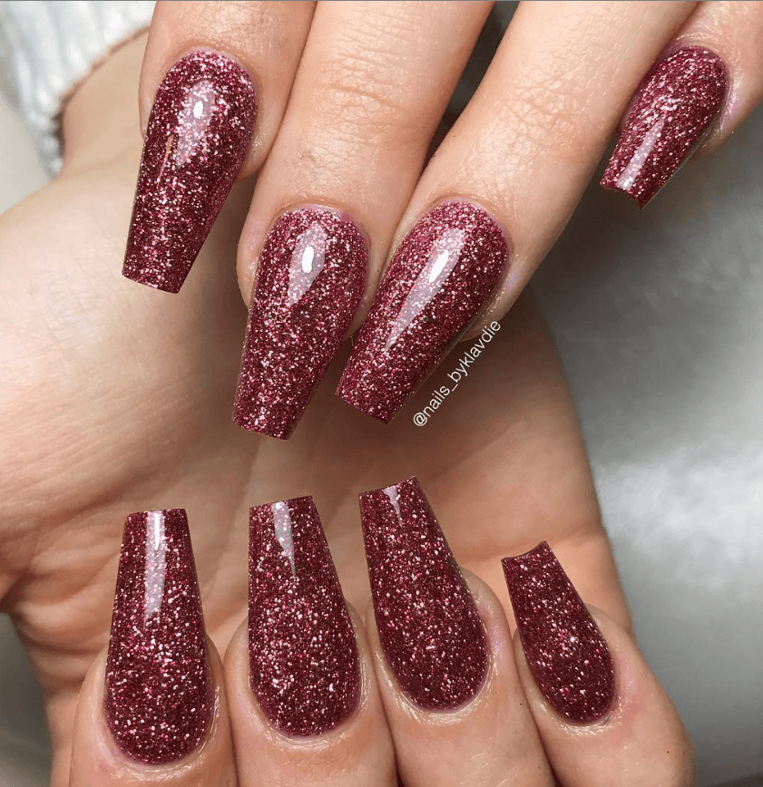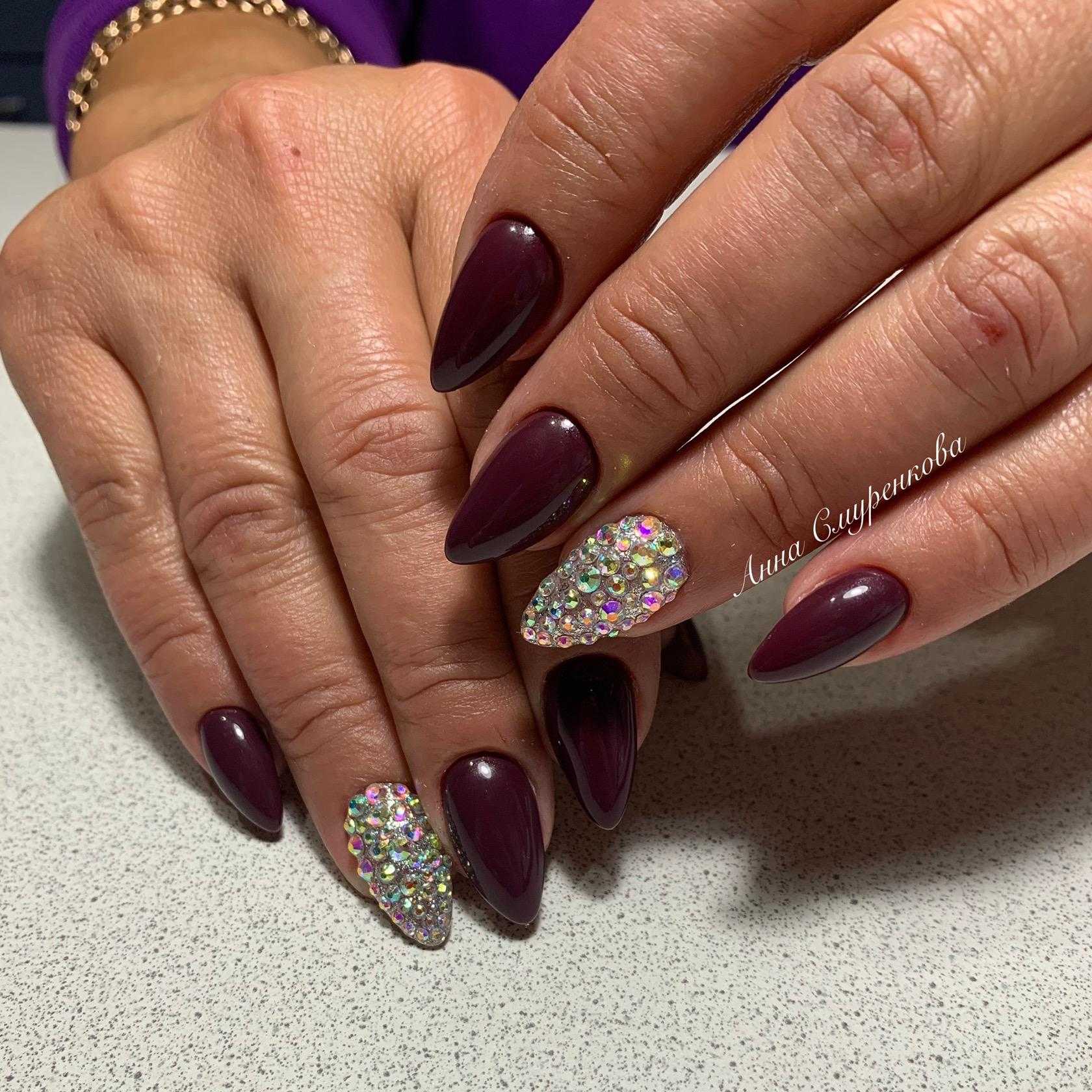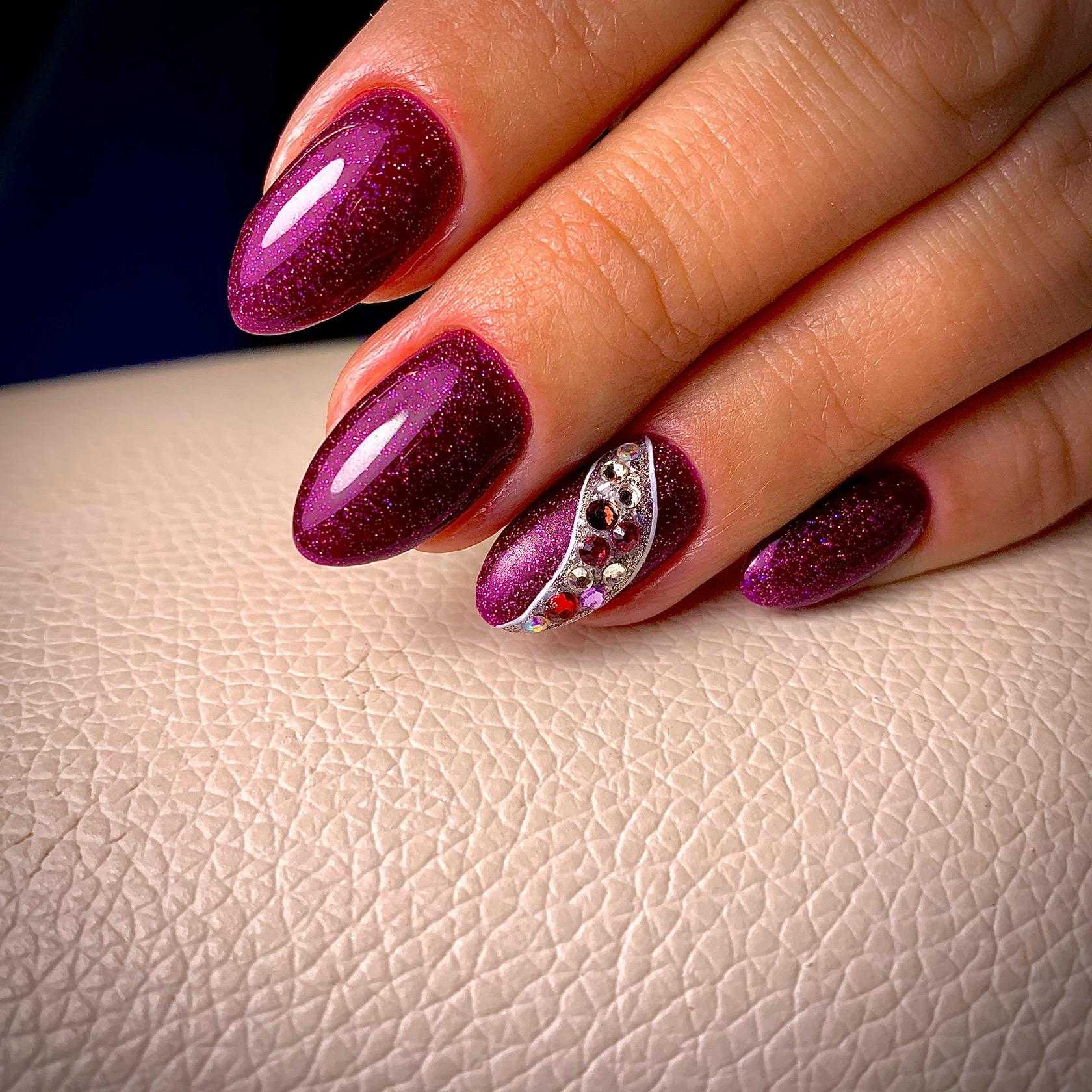Ноготки миндалевидной формы считаются эталоном женственности и изящества, поэтому прекрасно подходят для выполнения маникюра в бордовых тонах. При этом плавность линий кончика ноготка позволяет примерять самые разные техники, начиная от классического однотонного покрытия, заканчивая абстрактными композициями и нестандартной линией френча. Блёстки можно использовать для нанесения красивых узоров, выделения частей ноготка или прорисовки деталей. Любая вариация смотрится очень привлекательно. Одно «но», проявить свои способности миндалевидная форма может только на средних или удлинённых ногтевых пластинах.