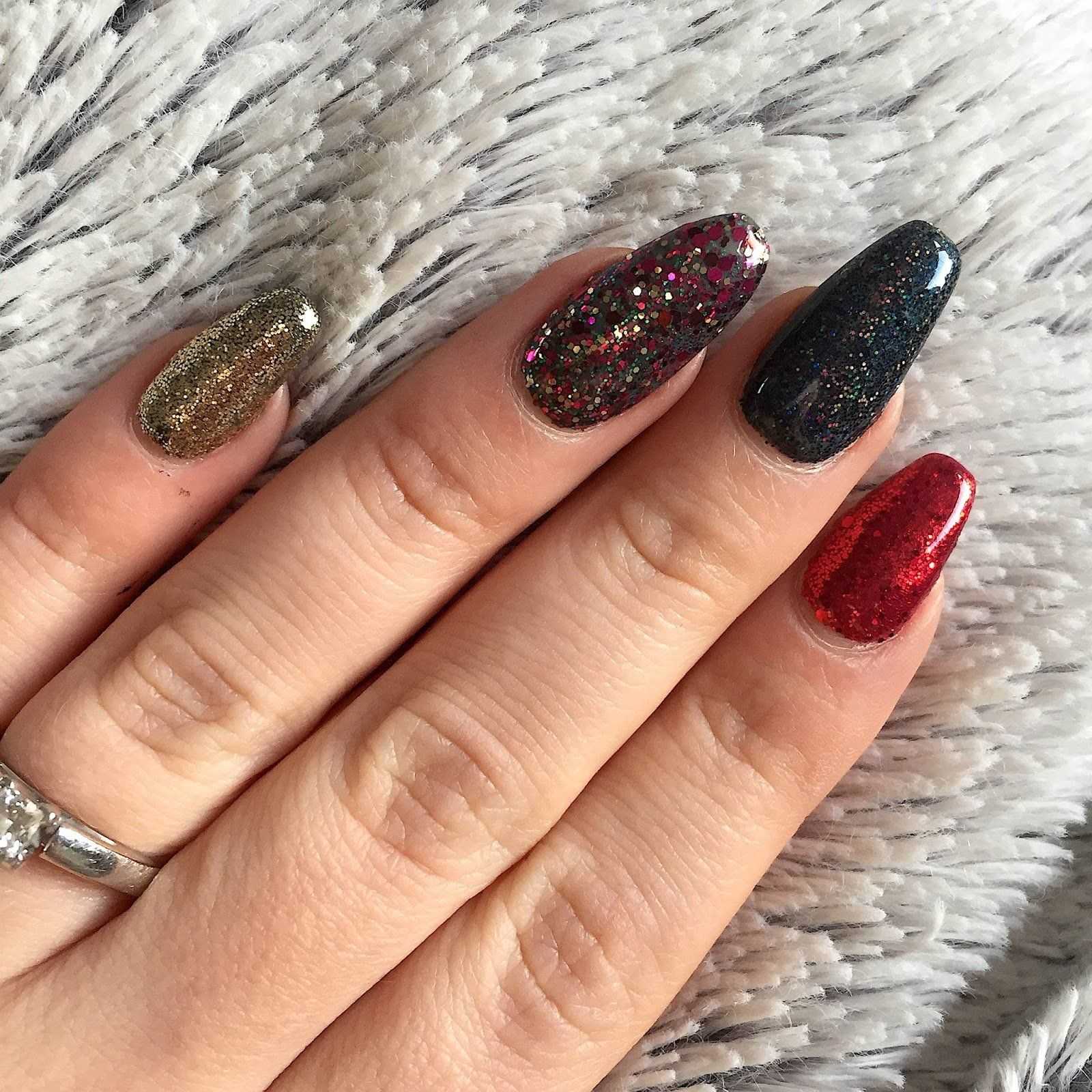 Здесь важно выдержать баланс цветовой палитры и совместить сочетаемые оттенки в одной тональной группе: холодный черный и холодный красный либо же теплый черный и теплый красный, но тогда блестки лучше применить не в серебре, а в золотом перламутре