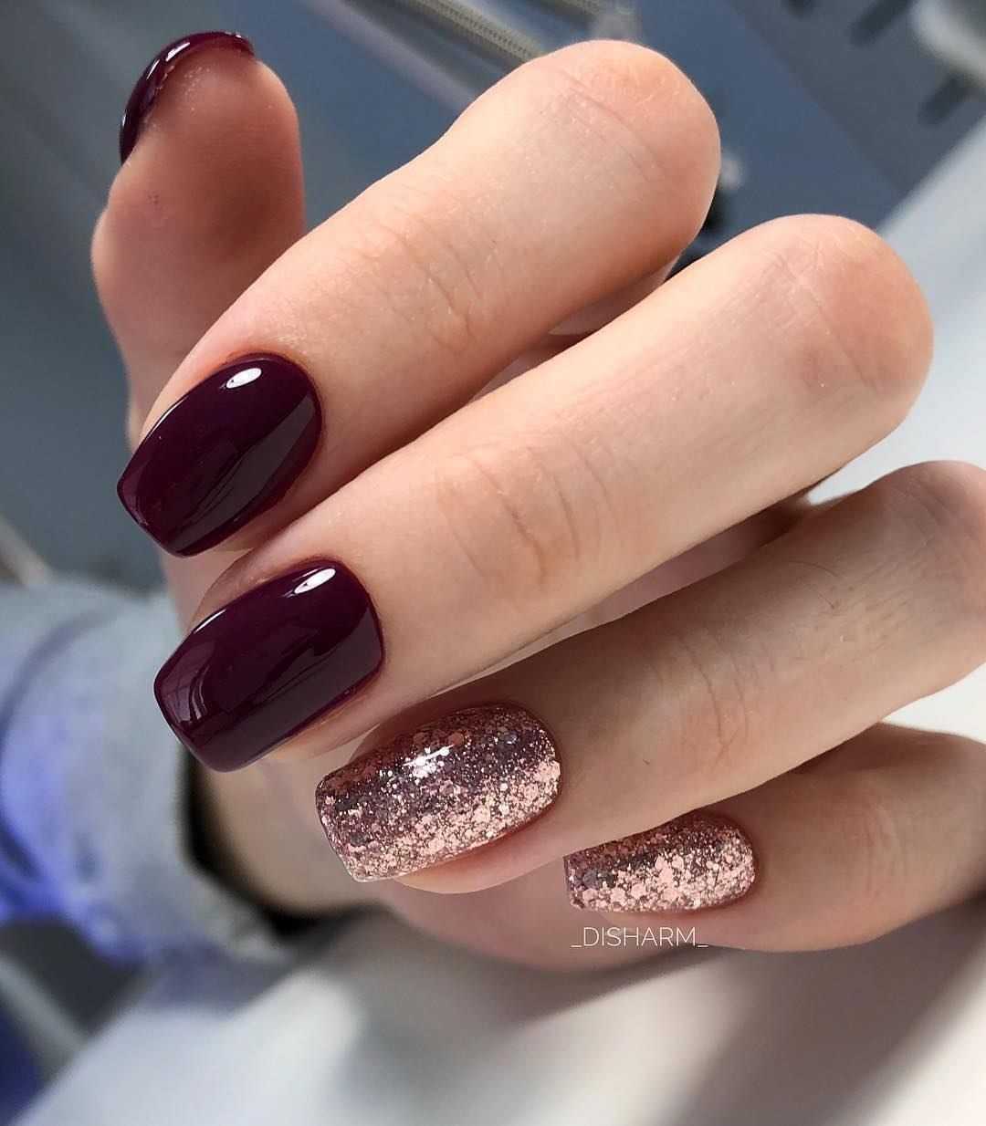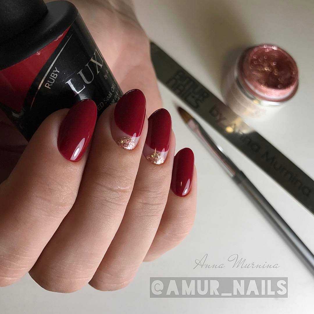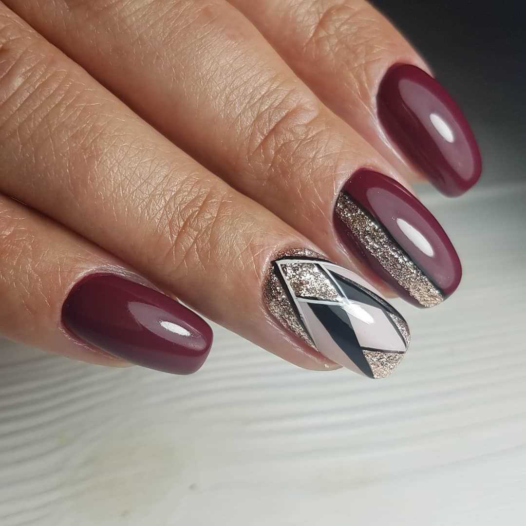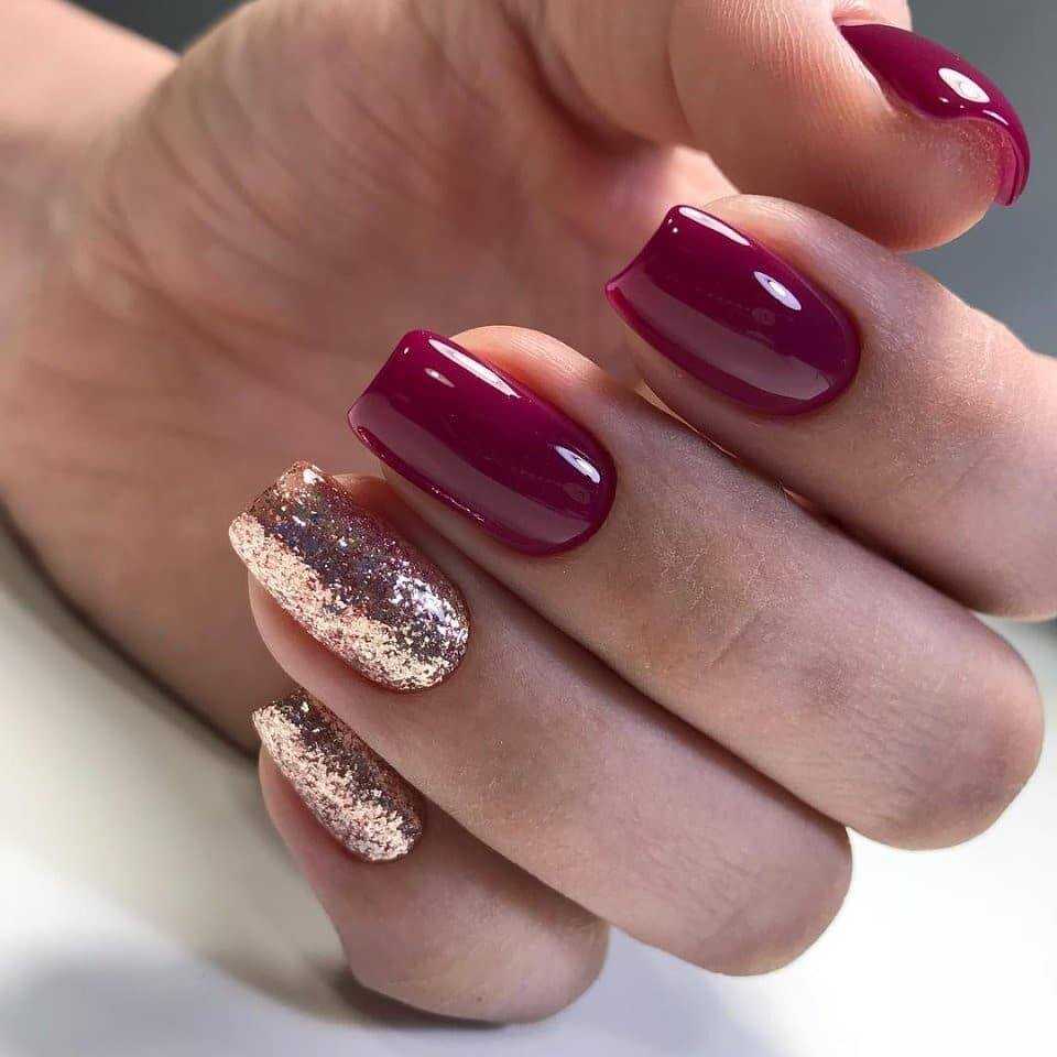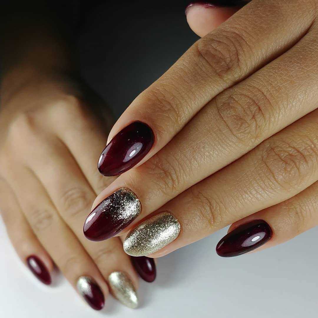 Золотистые акценты на ногтевых пластинах с бордовым лаком вызывают абсолютно противоположные чувства, если сравнивать с предыдущим предложением, ведь сияние золота – это всегда страсть и буря эмоций. Следовательно, подобное решение больше подходит барышням, предпочитающим тёплую гамму оттенков. Как и в случае с серебром, золотистые блёстки очень красиво смотрятся на кончике и у основания ногтевой пластины, могут украшать ноготок полностью или использоваться для нанесения узоров. В этом случае каких-то особых правил и техник не существует. Главное отличие – настроение, которое создаётся при помощи блестящих деталей и визуальное восприятие драгоценного сияния.