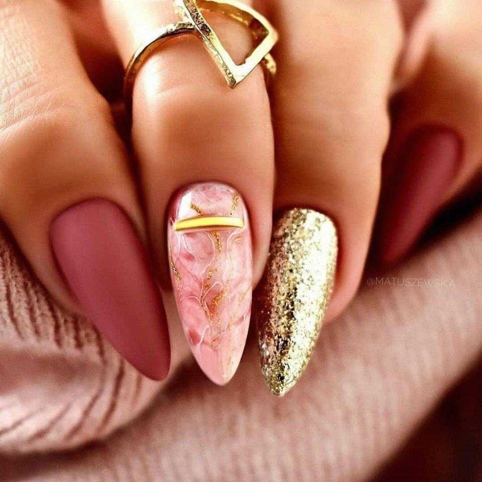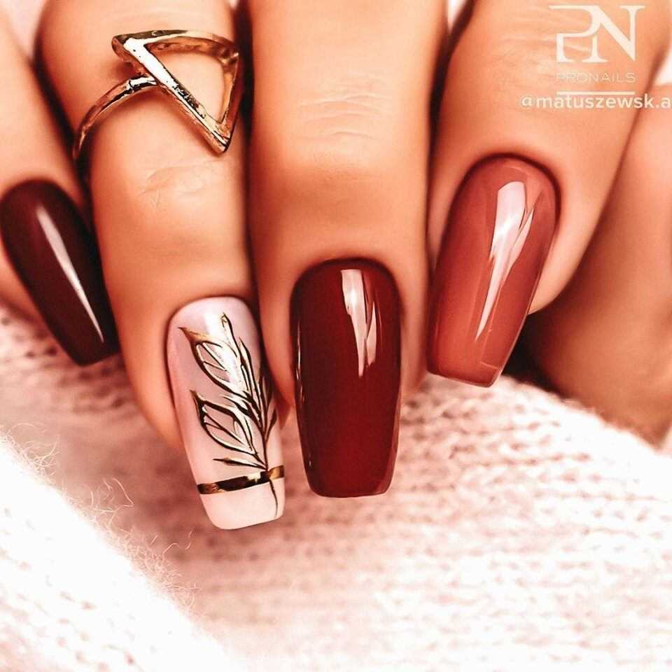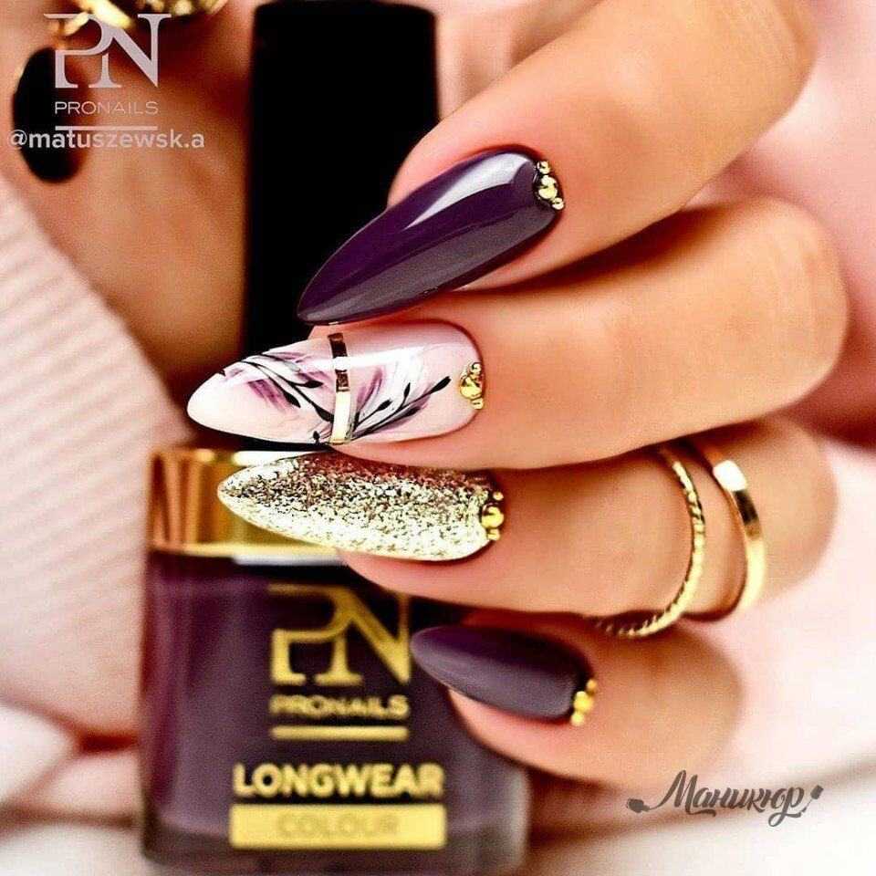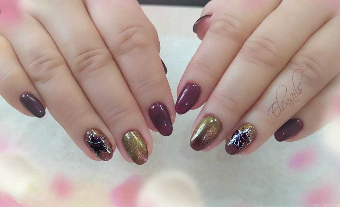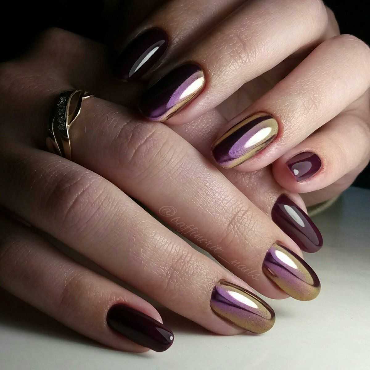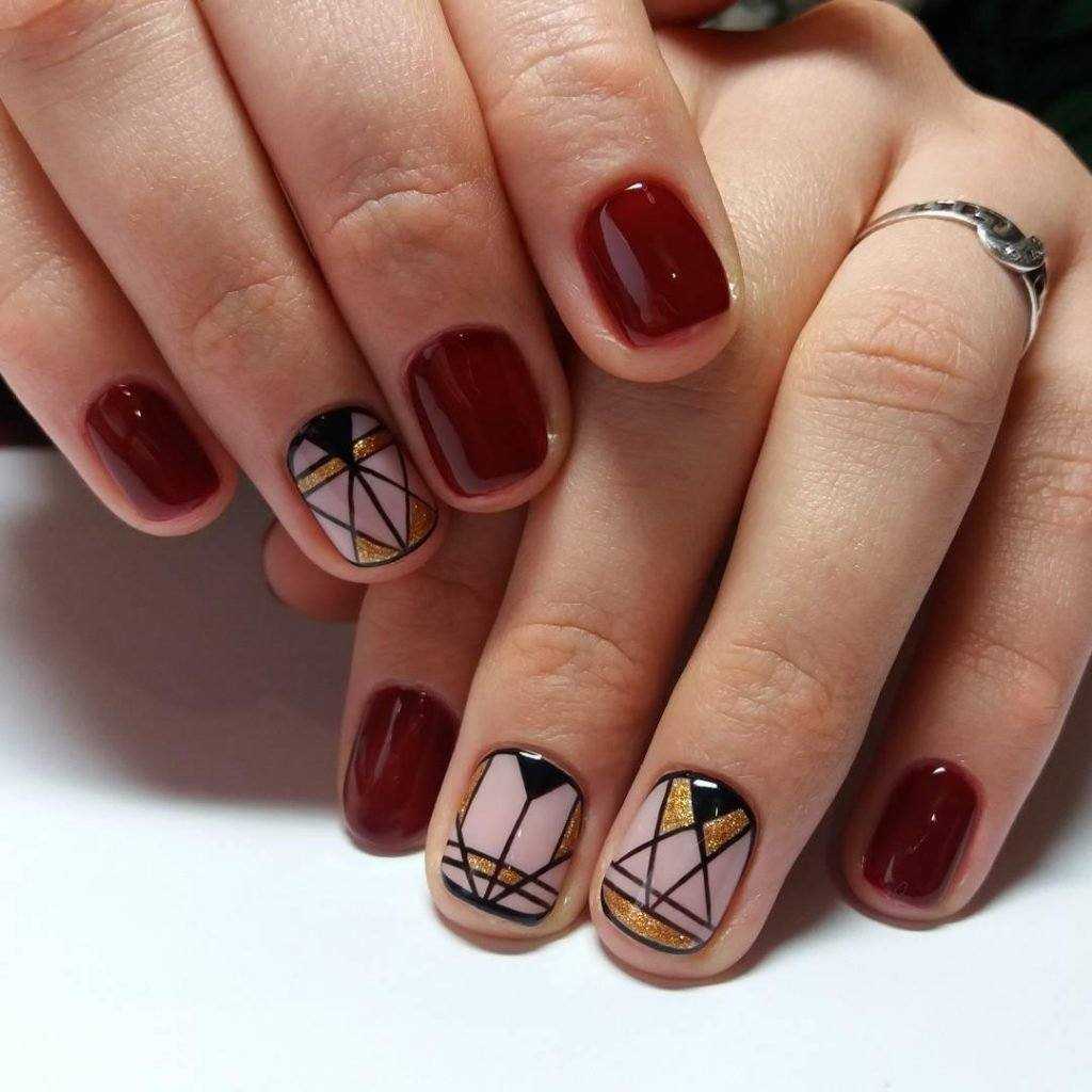 Золотистые акценты на ногтевых пластинах с бордовым лаком вызывают абсолютно противоположные чувства, если сравнивать с предыдущим предложением, ведь сияние золота – это всегда страсть и буря эмоций. Следовательно, подобное решение больше подходит барышням, предпочитающим тёплую гамму оттенков. Как и в случае с серебром, золотистые блёстки очень красиво смотрятся на кончике и у основания ногтевой пластины, могут украшать ноготок полностью или использоваться для нанесения узоров. В этом случае каких-то особых правил и техник не существует. Главное отличие – настроение, которое создаётся при помощи блестящих деталей и визуальное восприятие драгоценного сияния.