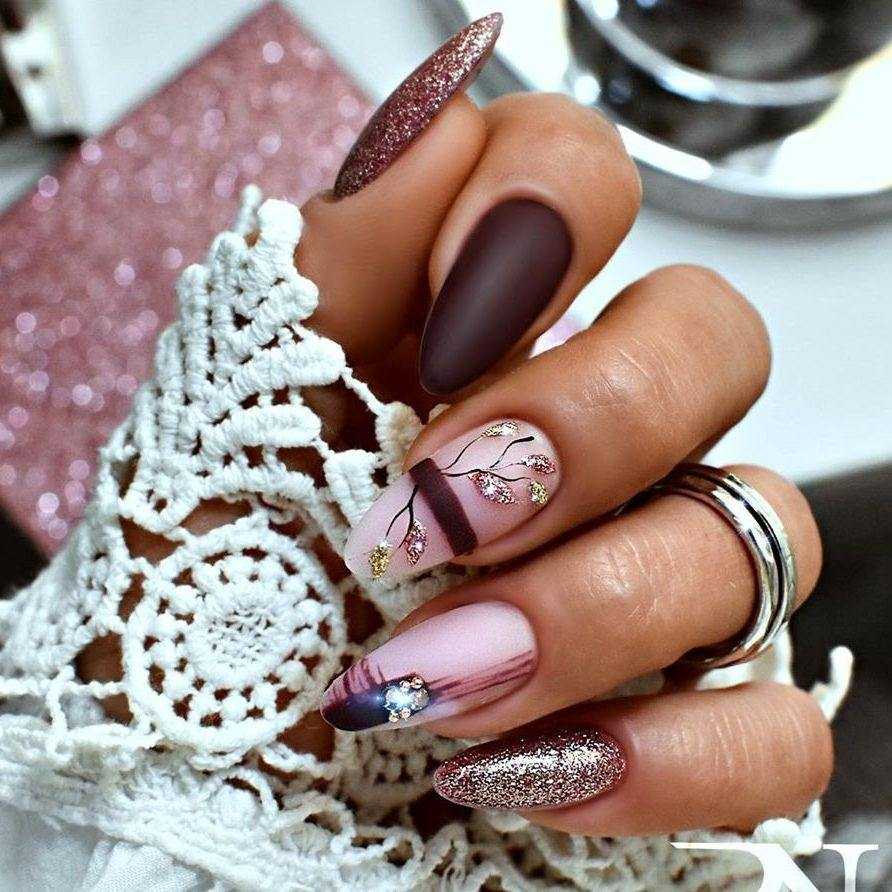 Одним из самых популярных стало совместное использование глянцевого и матового финишного покрытия на одной руке или на одном ногте. Также в моде сочетание матового лака с блестящим декором (фольга, пайетки, стразы).