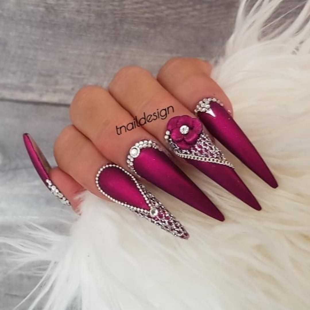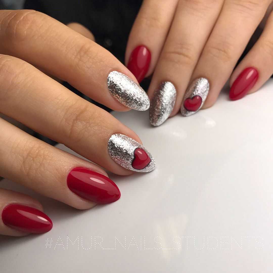Серебро красиво оттеняет красный тон, от чего его слишком большая яркость немного теряется. Поэтому если не хотите делать сильно вульгарный вид маникюра, то лучше сделать его с добавлением серебра.