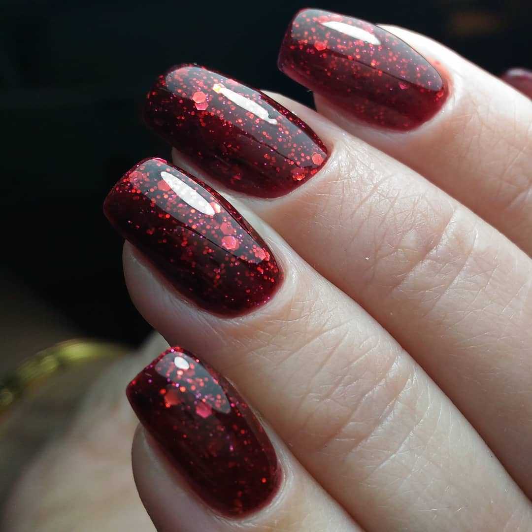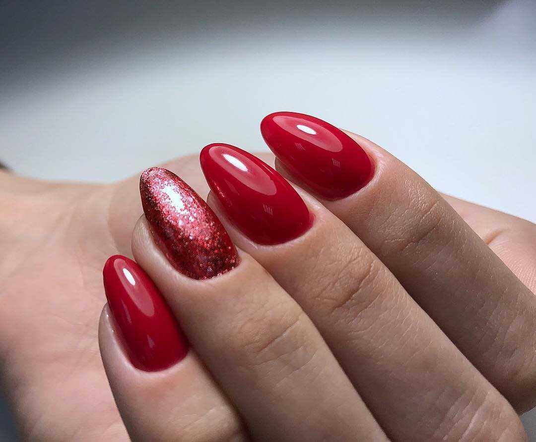 Элегантный, но очень простой маникюр красным лаком с блестками на нарощенных ногтях миндалевидной формы.