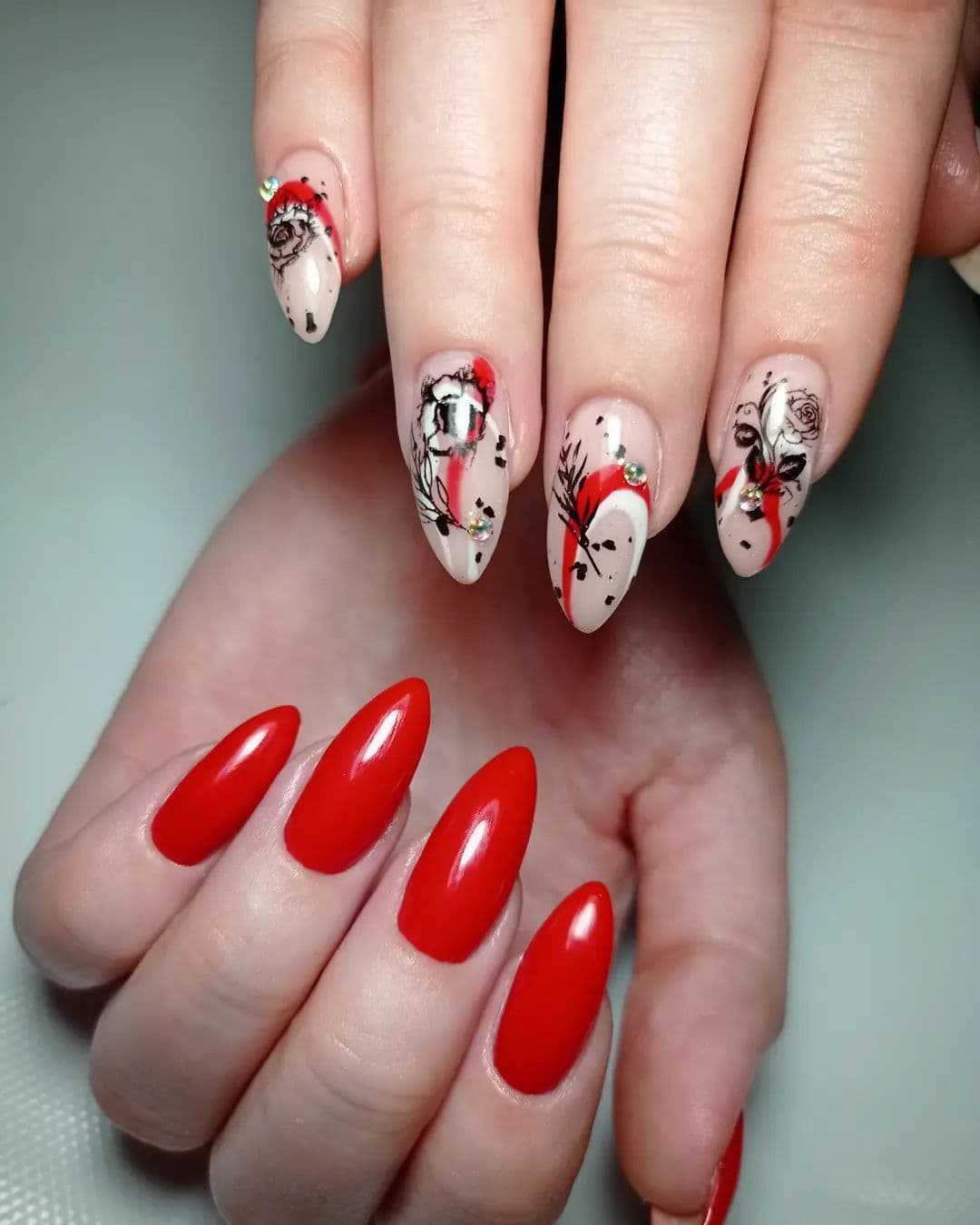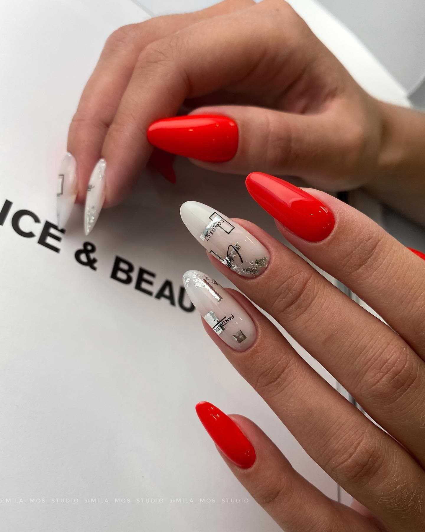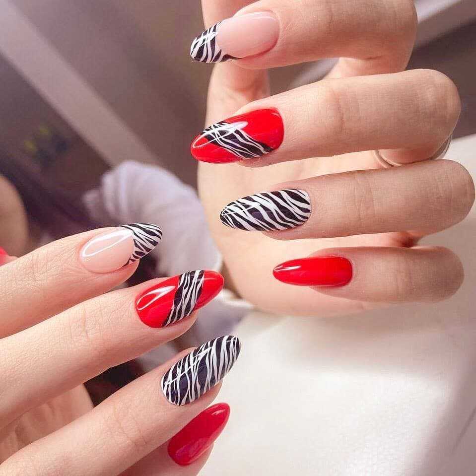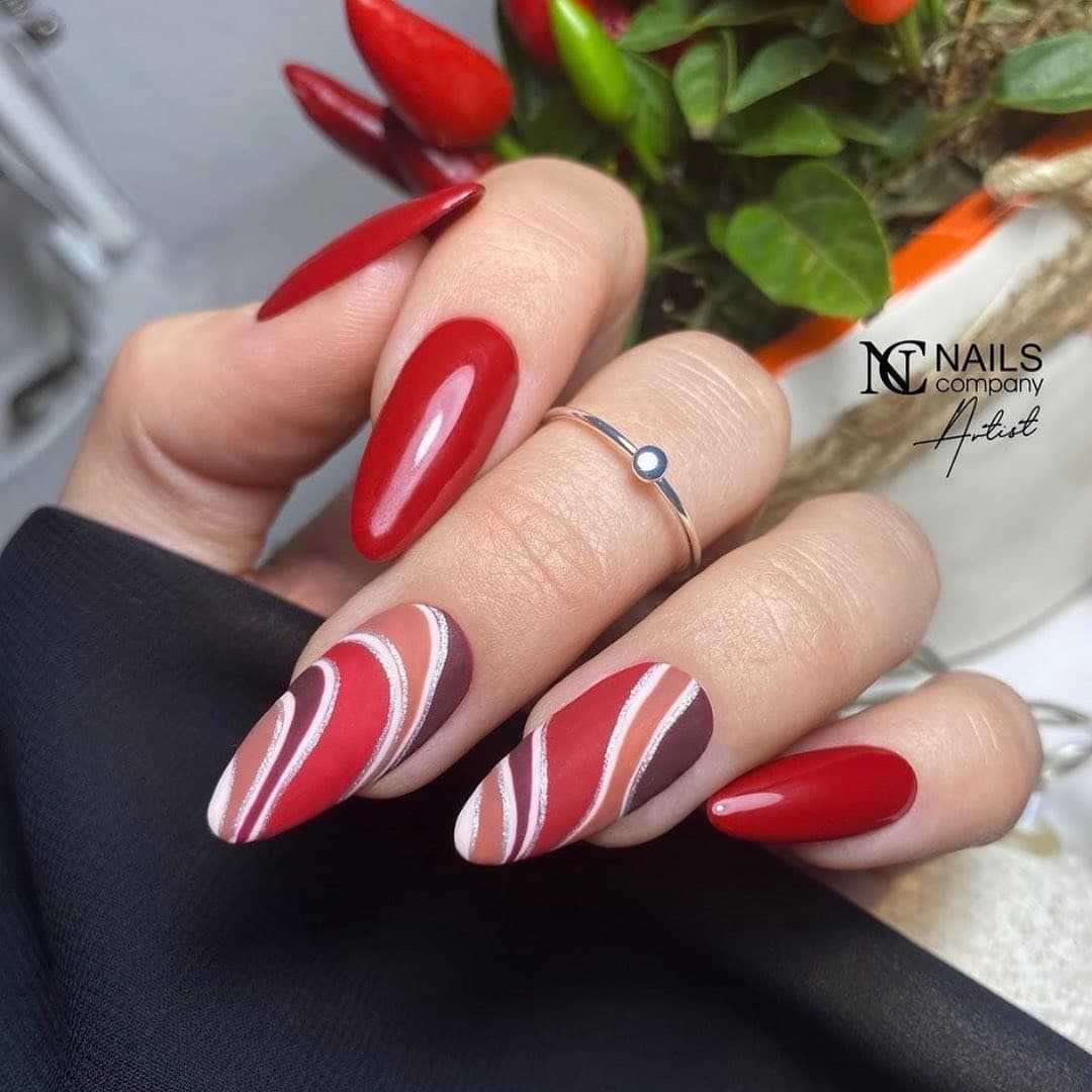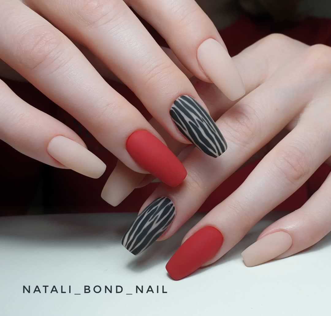 Один из самых горячих трендов в дизайне маникюра можно смело использовать с красным цветом. Сегодня в моде геометрический нейл-арт в любом проявлении: начиная от лаконичных линий и паутинок заканчивая сложными объемными конструкциями. Если хочется чего-то простого, всегда можно ограничиться лаконичной клеткой или узором из ромбов. А еще, всегда актуальны абстракции, так что смотри следующий блок, чтобы почерпнуть идеи для сочетания других цветов цветов с красным.