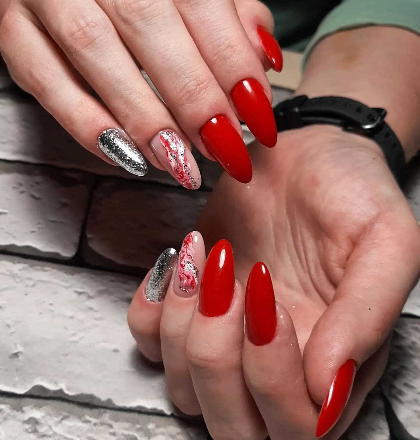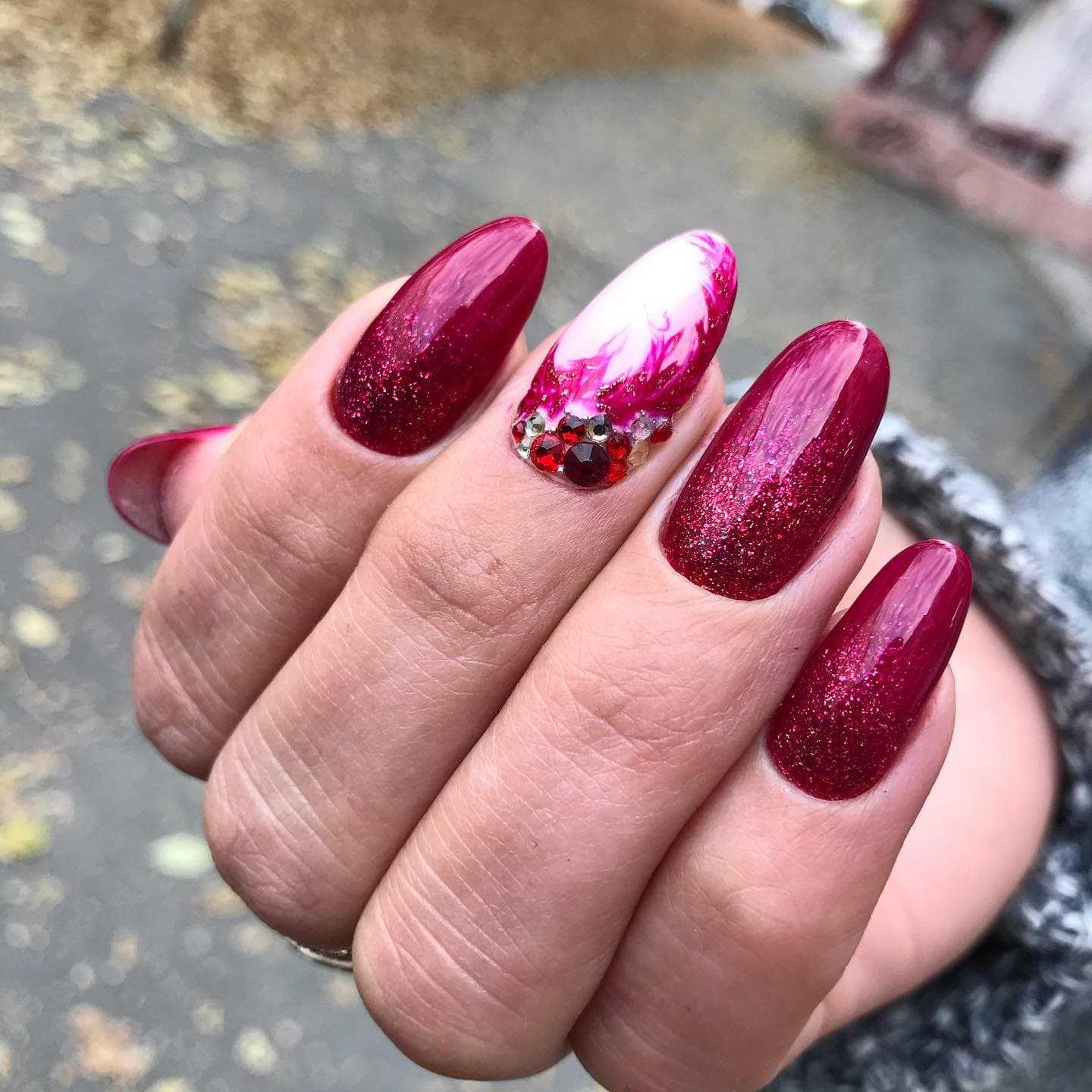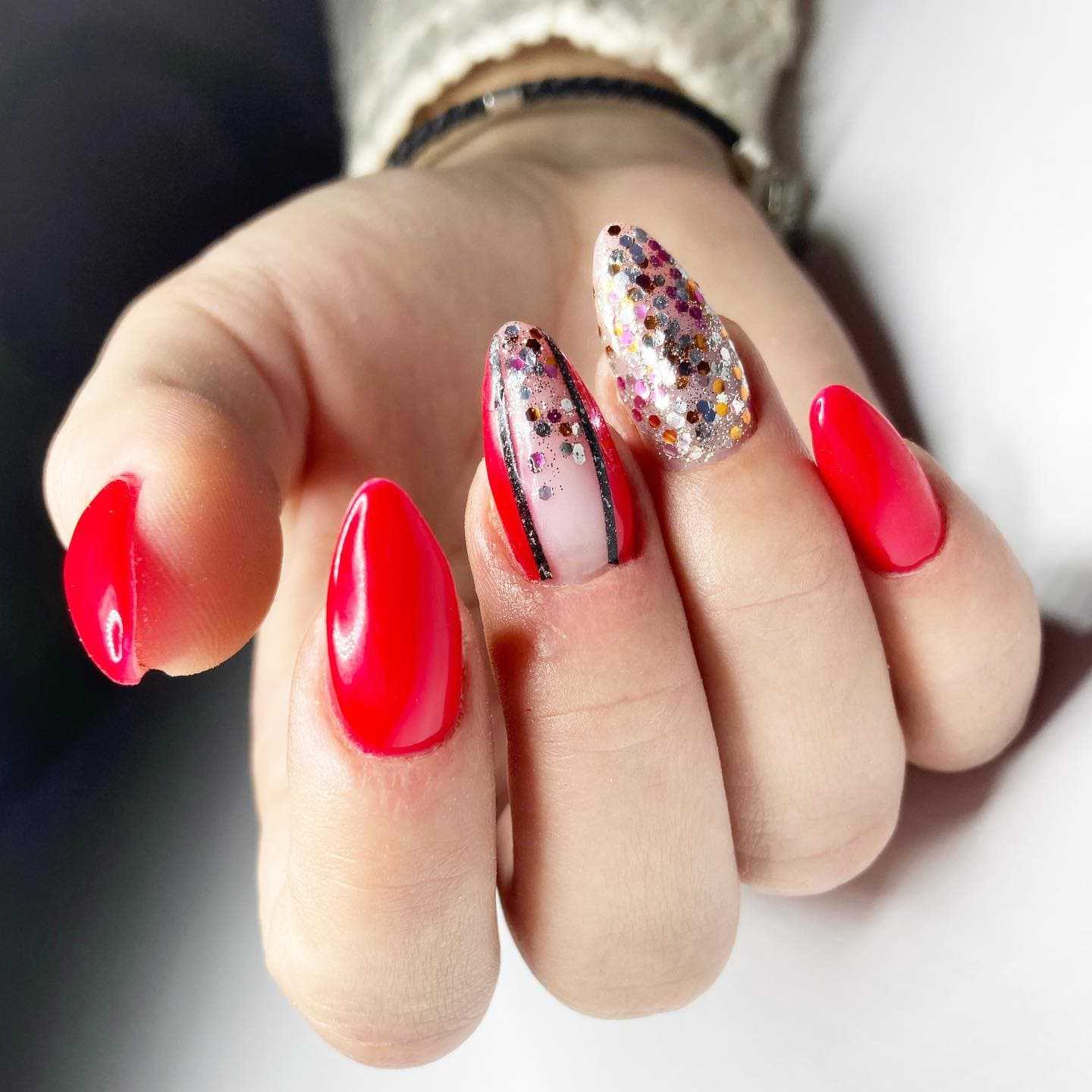 Если ты хочешь выжать максимальный градус шика из красного цвета, предлагаем тебе использовать блестки этого цвета. Опять же, здесь есть множество вариантов. Как минимум, ты всегда можешь сделать красный маникюр с деликатными стразами — их серебристый блеск будет отлично контрастировать с главным цветом. Ну а для более смелых девушек есть вариант с глиттером разного калибра, бархатным песком, создающим крутую шероховатую текстуру, или гель-лака с уже вмешанными в него мелкими блестками. Естественно, все это — красного цвета.