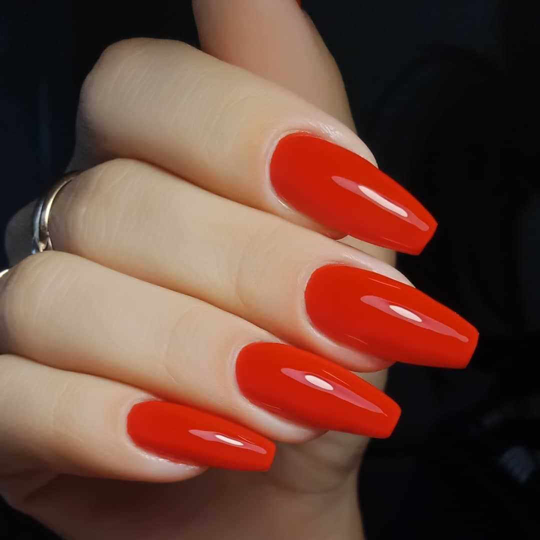 Экстра-длина сама по себе смотрится эффектно и привлекает внимание. Чтобы сбалансировать общий вид маникюра, стоит выбирать максимально нейтральные оттенки красного