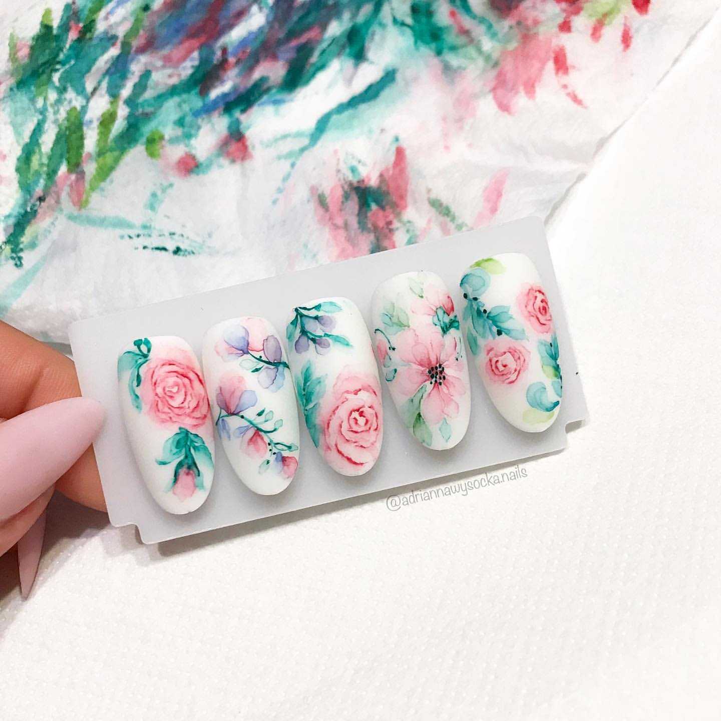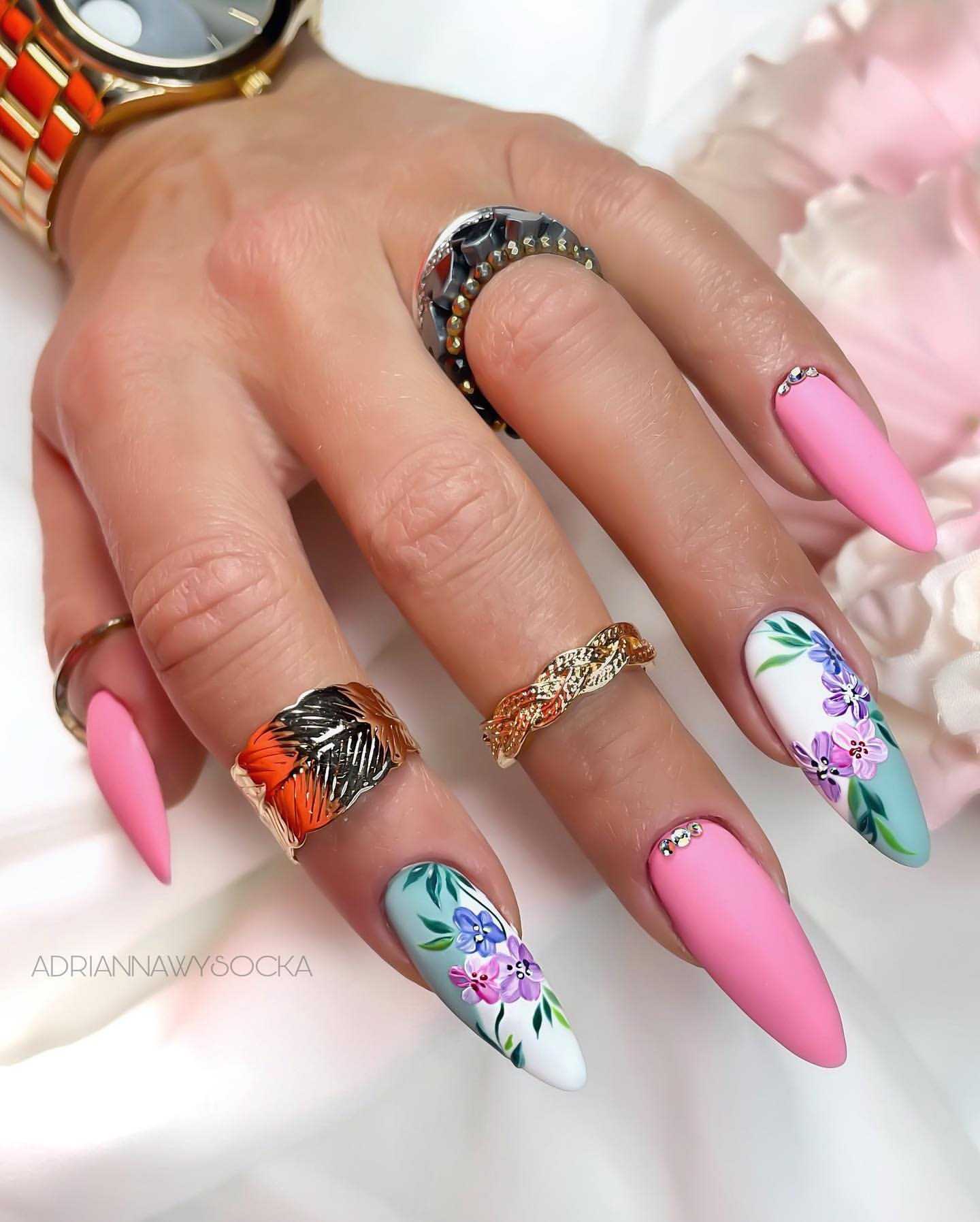 - Сочетание гладких поверхностей и цветочного узора. Такой рисунок легко получить при помощи специальных наклеек. Но для гармоничного результата нужно правильно выбрать цвета, ведь цветочными наклейками будут выделяться только безымянные пальцы, а остальные будут покрыты синим и розовым цветом. Оба этих тона должны повторяться а цветочной наклейке.
