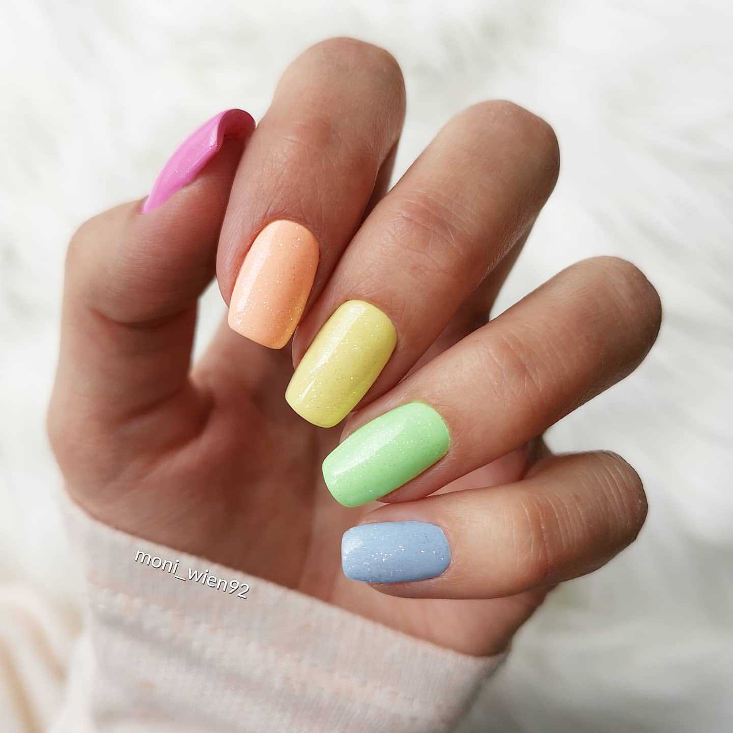 Можно выполнить градиент горизонтально или вертикально. Ярко или приглушённо. Все зависит только от вашей фантазии и настроения. К примеру, для сочного эффекта понадобится ярко-зеленый и голубой. Для более мягкого используйте белый, а соседние ногти покройте одним цветом и матовым топом.