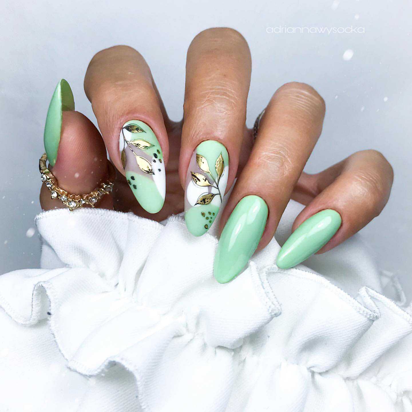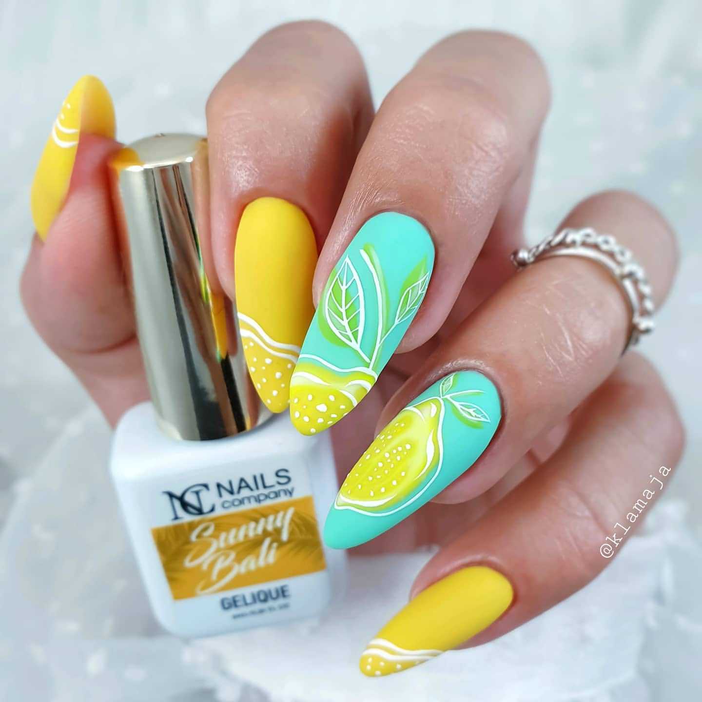 Желтый и мятный — это два лидирующих цвета летнего сезона 2023 года. По всей цветовой гамме они идеально перекликаются друг с другом создавая при это шедевральный результат. Добавьте несколько геометрических линий ярко желтого цвета или нарисуйте им цветок на благородном мятном фоне. Для тех, у кого нет времени и желания заморачиваться с дизайном, nail мастера предлагают добавить многогранности мятному маникюру, окрасив в желтый цвет один из ногтей.