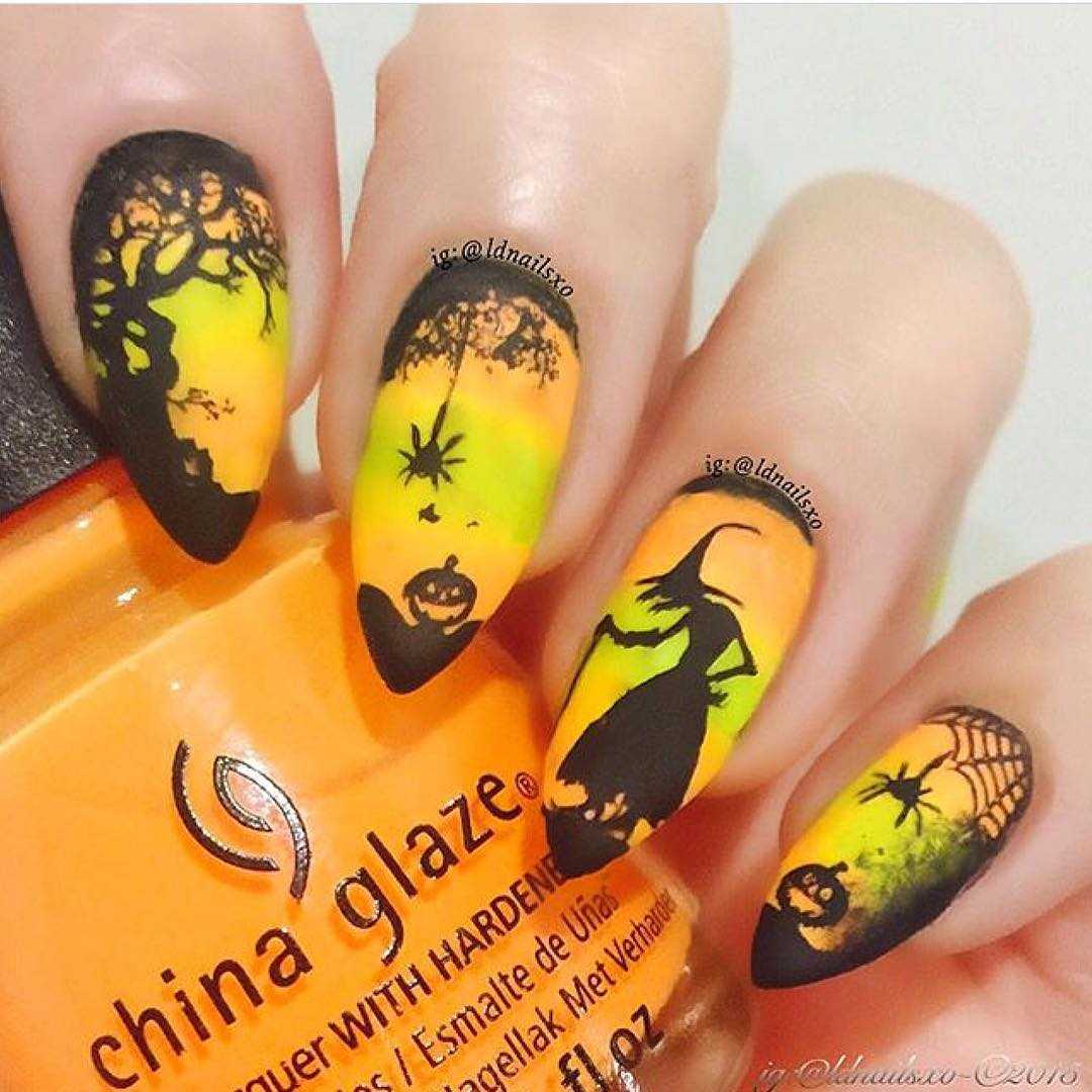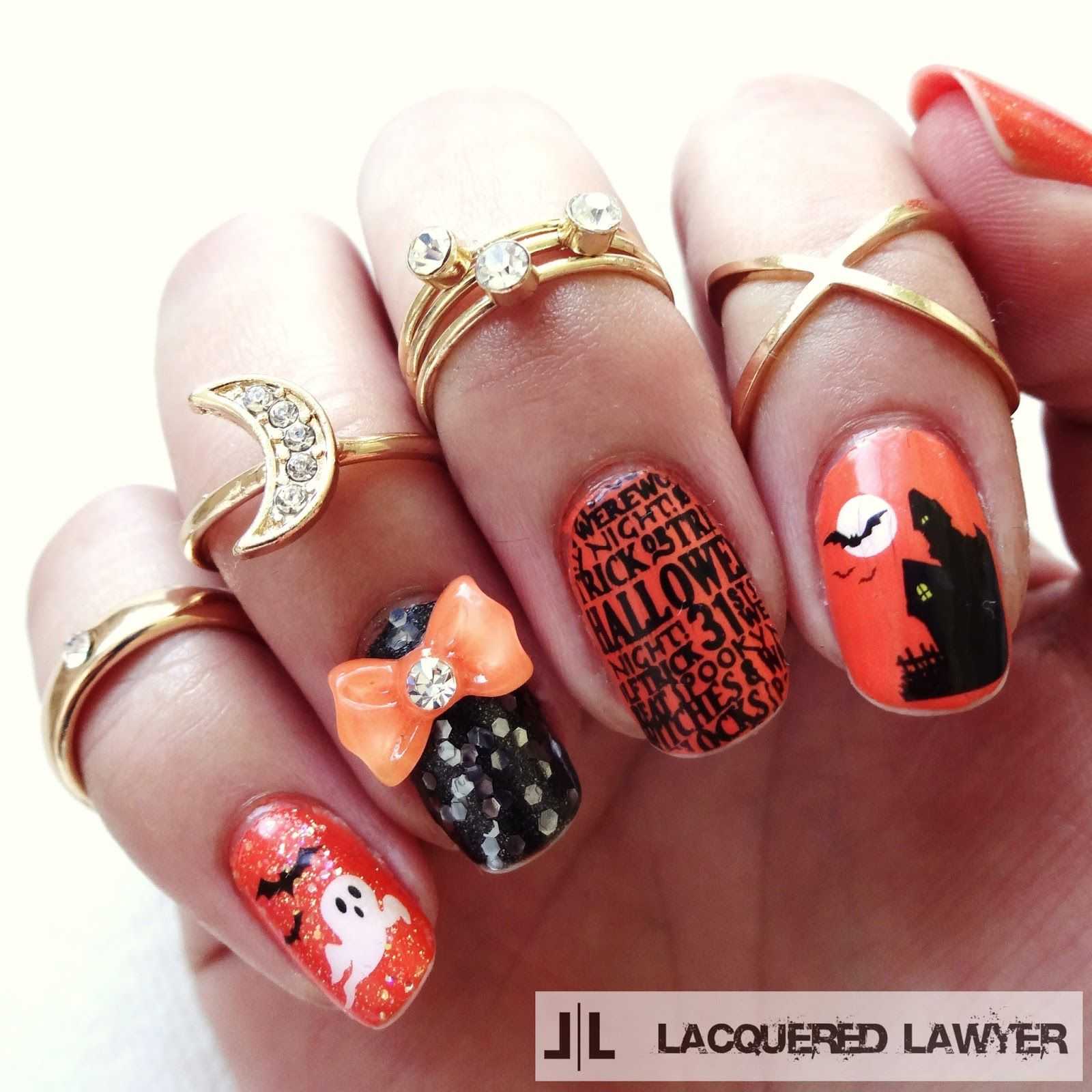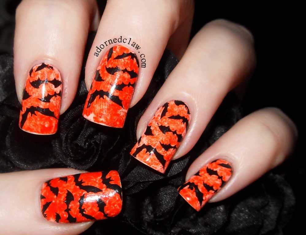 На чёрно-оранжевом фоне одинаково элегантно выглядят как серебряные, так и золотые ленты. Сочетание оранжевого с чёрным гель-лака создаёт заметный и оригинальный маникюр, который выполняется на любую длину и форму ногтей. При выборе техники нанесения дизайна следует руководствоваться стилем в одежде.
