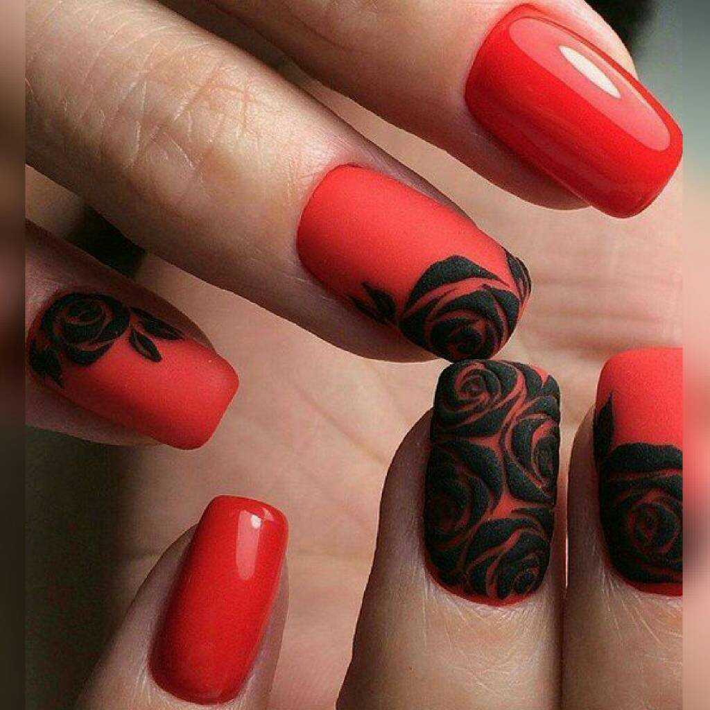 Красный маникюр с дизайном всегда выглядит интересно и живенько. Вариантов оформления великое множество. Идеи можно подчерпнуть в модных блогах. Новинка этого сезона: рисунки и узоры, покрытые бархатным песком. Можно сделать сплошной узор на всю ногтевую пластину или же украсить только ее часть.