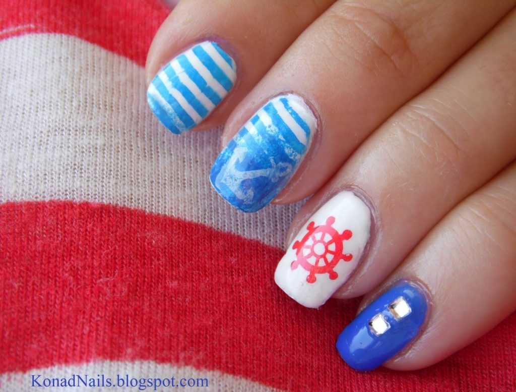 С чем у вас ассоциируется море? Многие, наверное, ответят с кораблями или морскими круизами. Поэтому маникюр в морской тематике можно разнообразить изображением якоря или корабельного штурвала. Если вы не уверены в том, что сможете их идеально нарисовать, то можете просто воспользоваться соответствующими наклейками. А те, кто не боится кропотливой работы, и вовсе могут выложить их изображения из мелких бусинок.