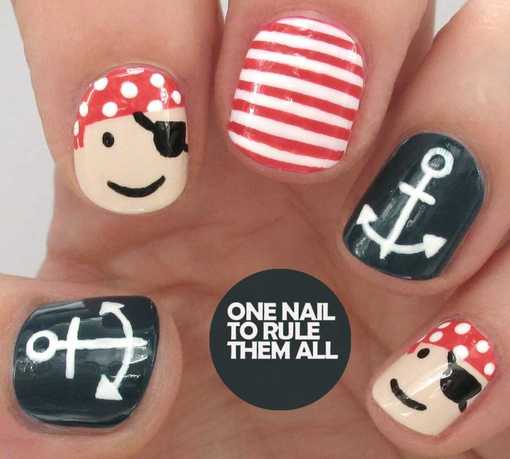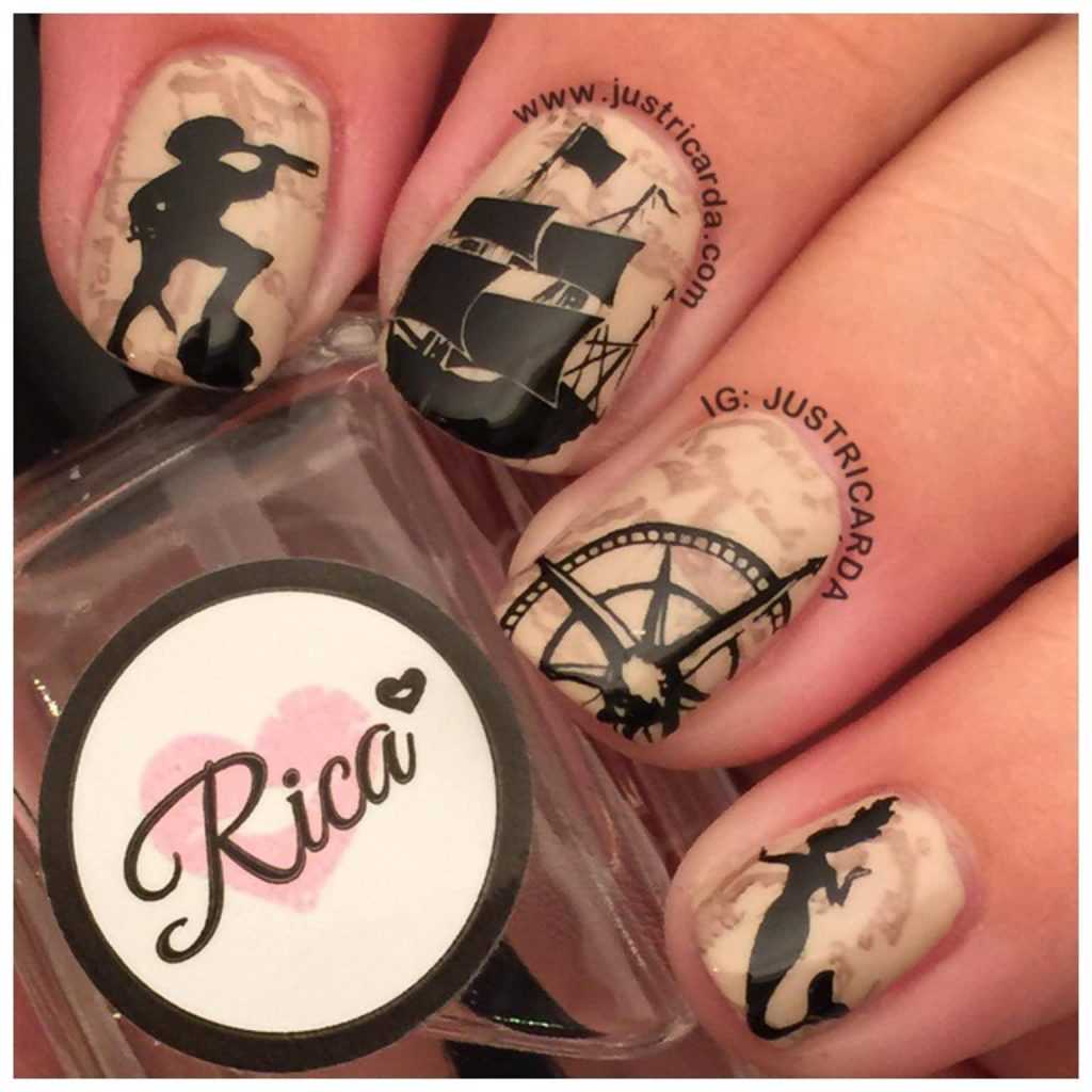 Для вас на выбор штурвалы, канаты, спасательные круги, якоря и многое другое. Если выполнить изображение этих атрибутов с помощью золотистого или серебристого лака, можно дополнительно украсить педикюр.