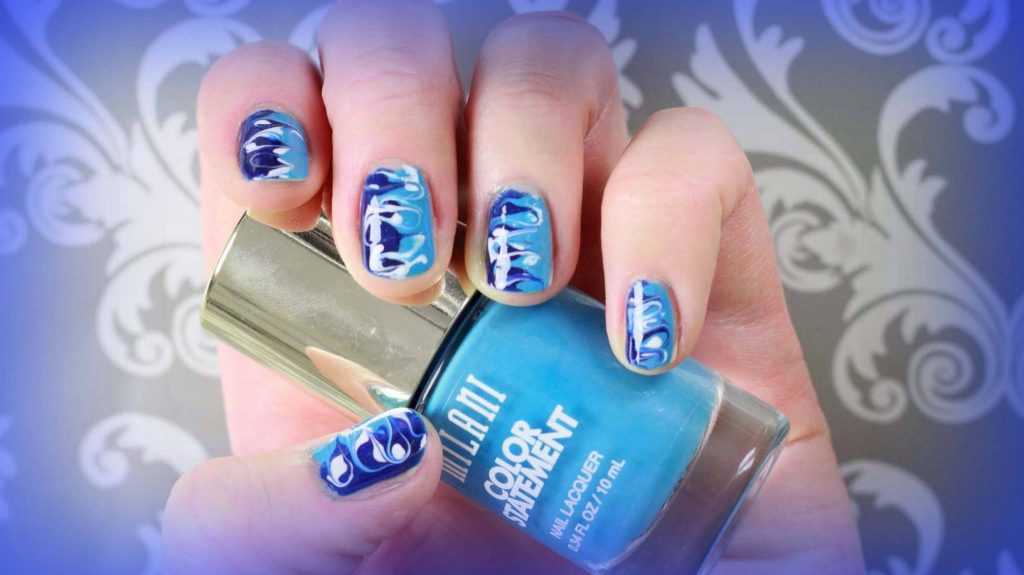 Использование водной техники. В холодную воду капните темно-синий, бирюзовый и белый лаки. Аккуратно с помощью зубочистки перемешайте оттенки, чтобы получились красивые оригинальные узоры. Затем опустите туда ноготок так, чтобы весь узор поместился на поверхности ногтевой пластины. У вас получился красивый оригинальный маникюр.