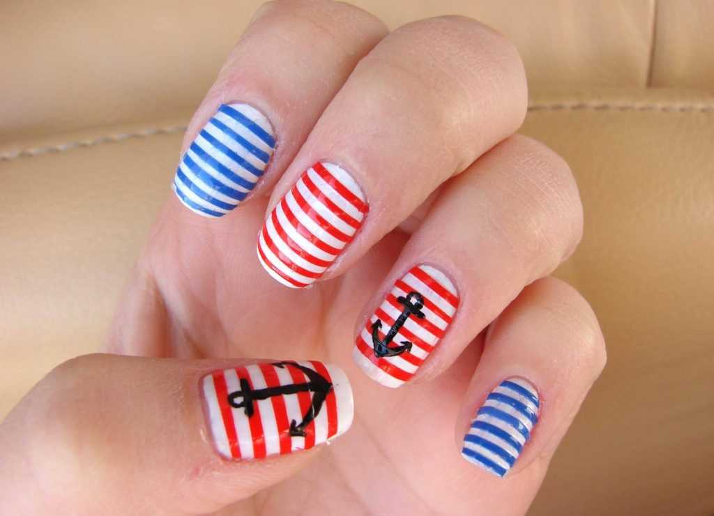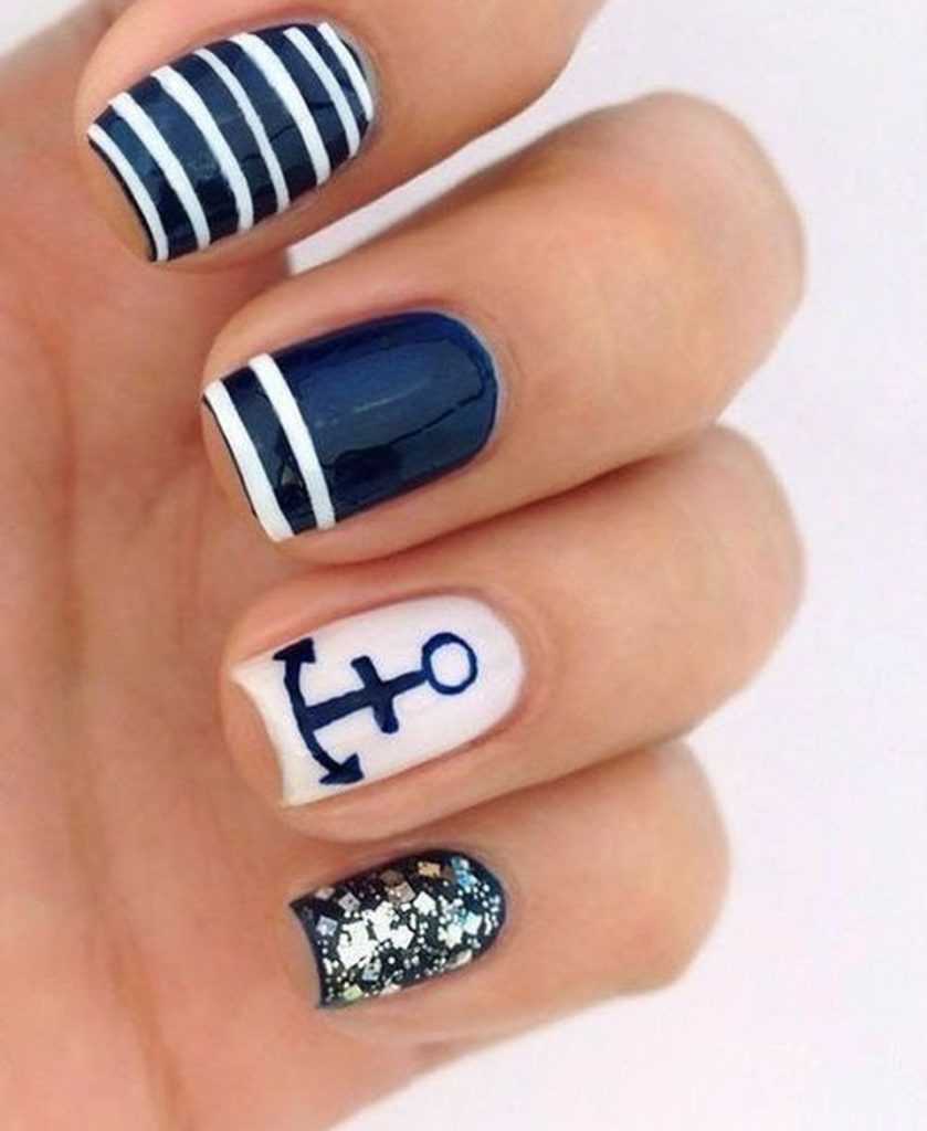 Неплохо якоря будут смотреться, если их нарисовать поверх горизонтальных полосок или даже дополнить им французский маникюр. Традиционно якоря рисуют синим или черным цветом. Но не менее эффектными они получаться, если их изобразить золотым или красным.
