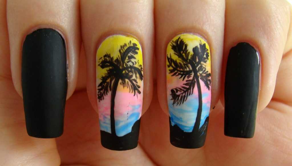 Минимализм. Вариант для более практичных модниц или ценительниц лаконичного стиля. Чтобы создать эффектный, но простой по вешнему виду маникюр, нужно покрыть пластины ногтей матовым лаком красивого оттенка. На одном ногте следует обязательно тонкими линиями нанести интересный сюжет: пальмы, яхту, парус.