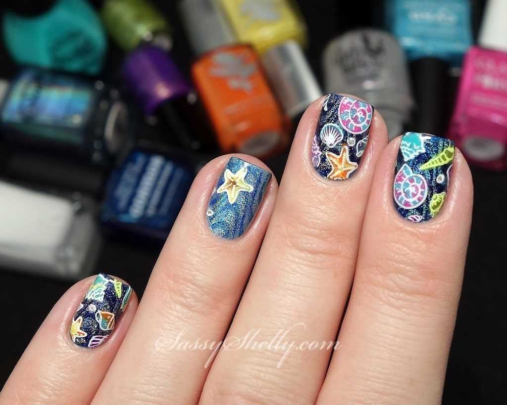 Настоящим произведением искусства ваши ноготки станут, если украсить их красивым рисунком или аппликацией обитателей морских глубин. Вам лишь нужно выбрать, кто это будет: черепашка, морская звезда, крабик, коралл или обычная ракушка.