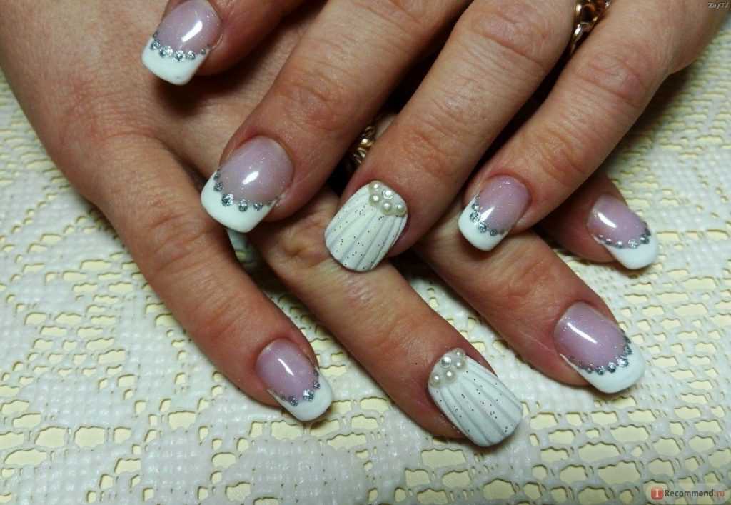 В качестве основного тона используют и чисто-белые, и теплые нюдовые, и холодные голубоватые оттенки. Зачастую мастера добавляют стразы или 3D-лепку на один из пальчиков. Замечательно выглядит нежный градиент, отливающий жемчужным блеском, или морская тематика – раковины, полированный «жемчуг», камешки.