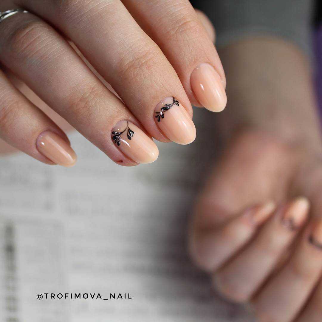Это достаточно контрастный вариант, который смотрится особенно эффектно на длинных ногтях. Данное сочетание отлично подойдет к любому образу, а уж вариантов его воплощения в жизнь может быть множество. Например, на однотонной нюдовой основе нарисовать тонкой кисточкой чёрные витиеватые узоры. Или же покрыть пальчики этими двумя видами лака, где два ноготка будут черными, а три — телесными. Главное, здесь надо понимать, что раз маникюр нюдовый, то чёрный должен стать его дополнением, а не подавлять.