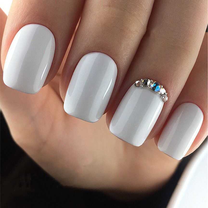 Для классической свадьбы подойдёт дизайн со стразами, узорами или покрытие однотонным лаком белого/кремового цвета. Для обладательниц коротких ногтей необходимо поработать над их формой. По мнению специалистов мира красоты, руки женщины украшают не длинные ногти, а красиво подкорректированная форма.