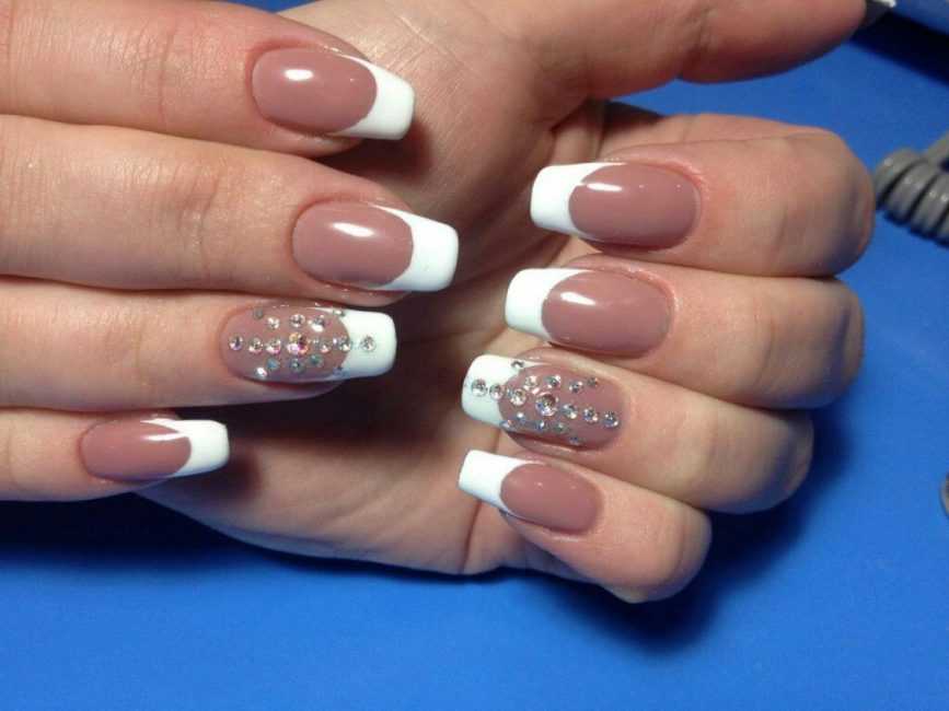 Существуют различные вариации французского маникюра для невесты. Например, один ноготок можно украсить стразами или красивым рисунком. Это привнесёт в образ невесты особую изюминку.