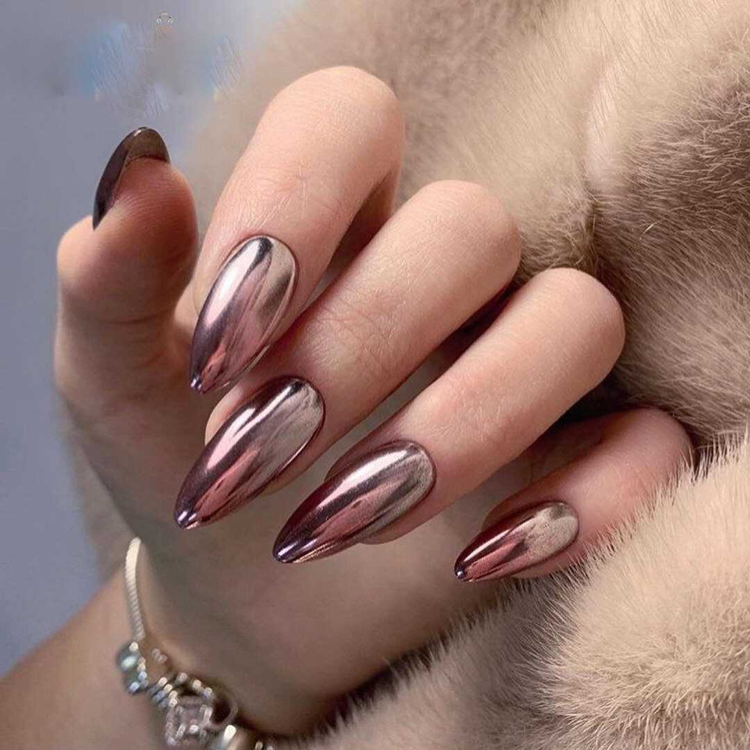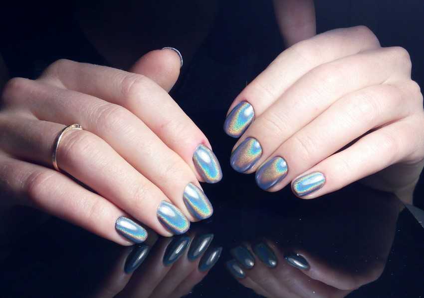 Наиболее популярными оттенками зеркального маникюра являются золотой и стальной, напоминающие отполированный благородный металл.