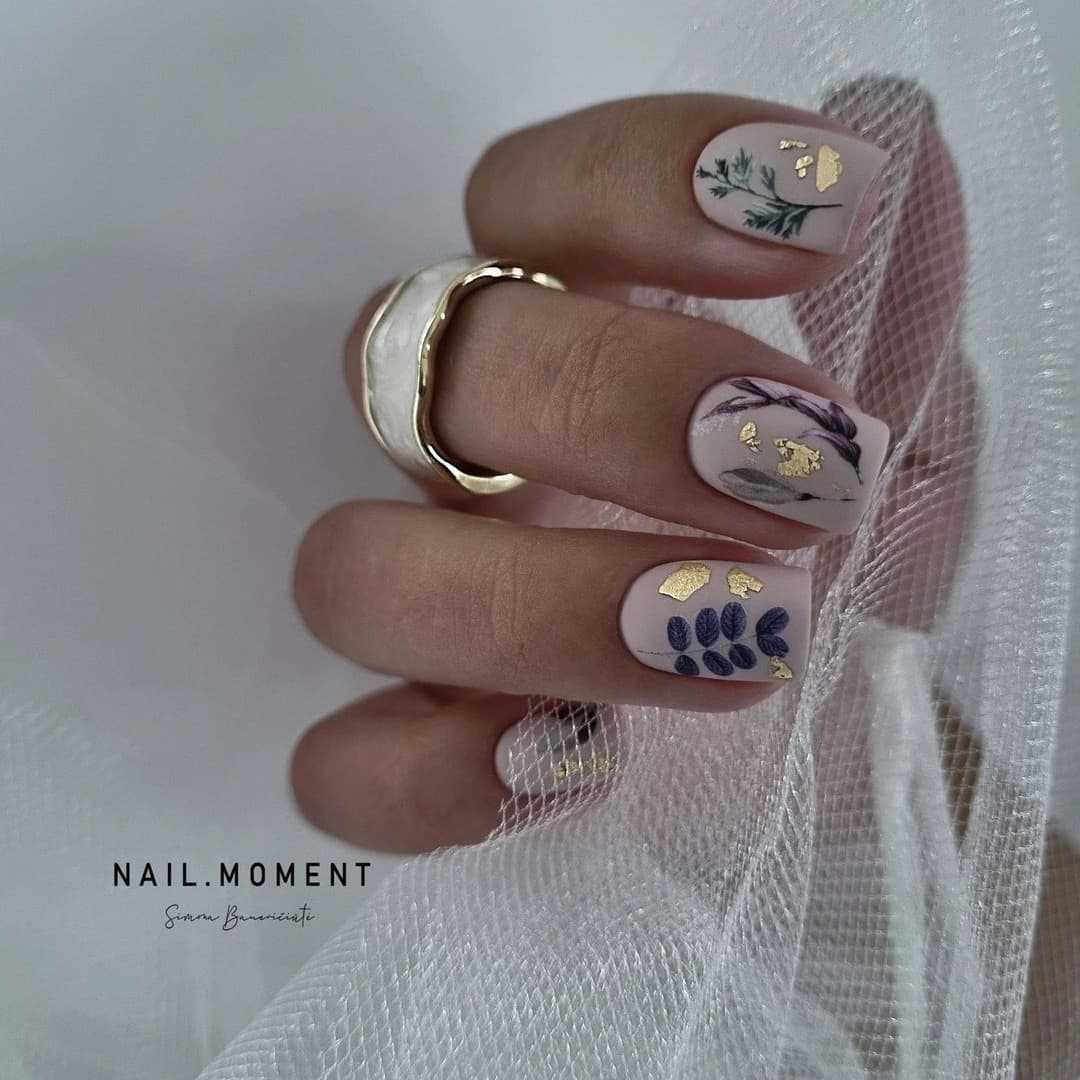 Для лаконичного нейл-арта можно покрыть ногти молочно-розовым оттенком. Указательный и средний пальцы сделать матовыми. На них же разместить парный рисунок нежной веточки, выполненный черным или синим лаком. Получится очень стильно, если ветка будет как-бы скользить по ногтям, спускаясь по бокам с кончика одного ногтя к лунке другого.
