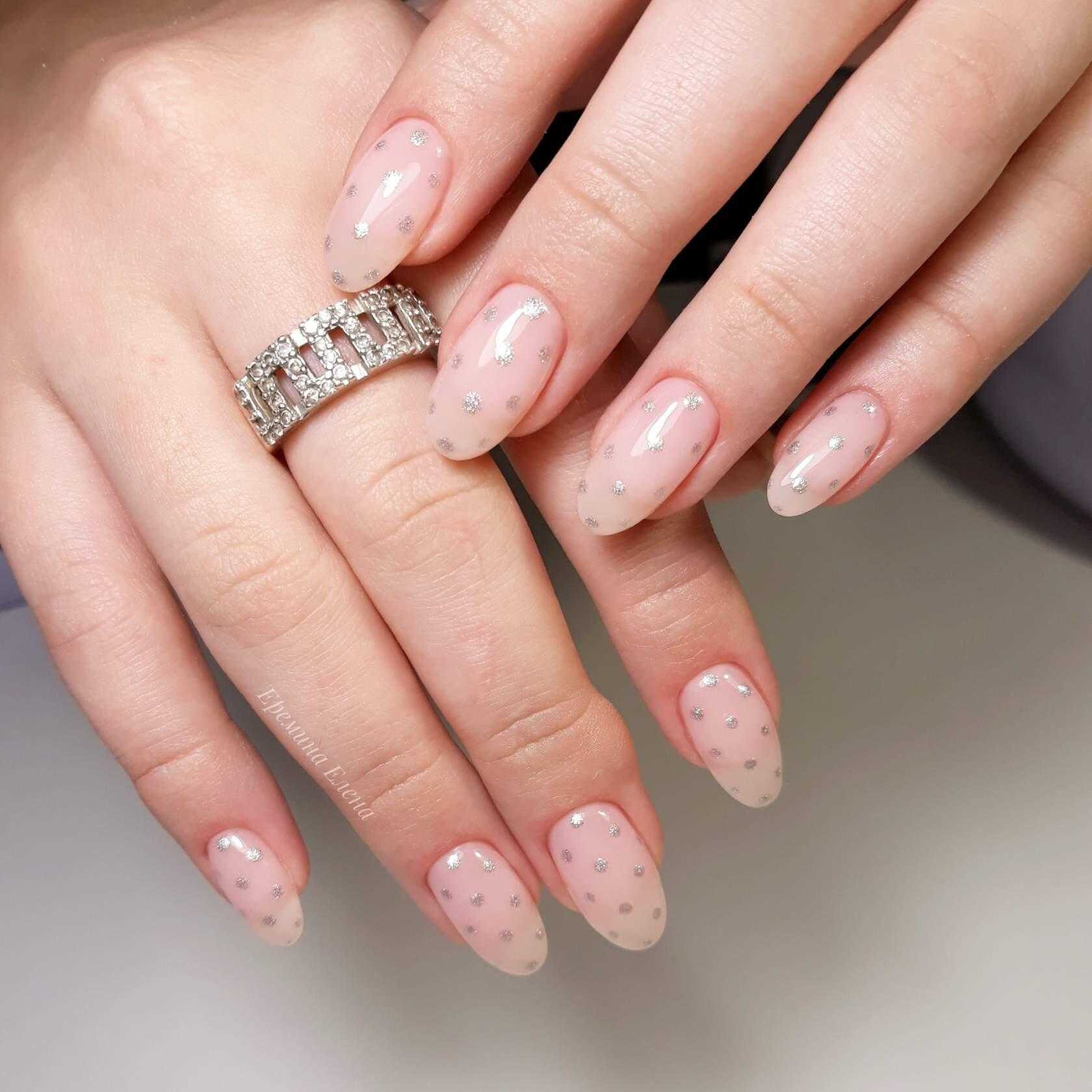 На фото модные тенденции 2019 нюдового дизайна ногтей с блестками: