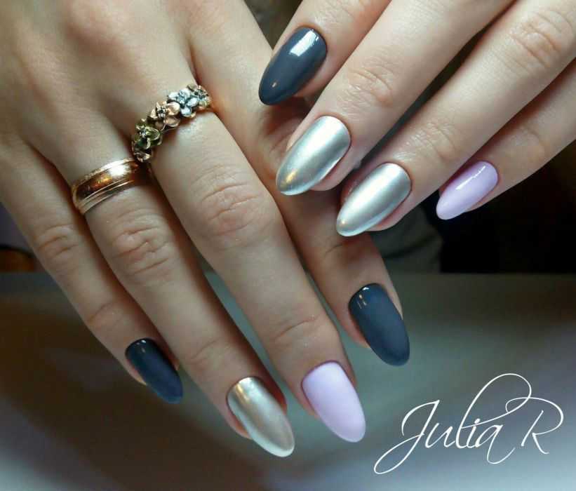 Начнем, как обычно, с краткого обзора модных тенденций в nail-дизайне. Стоит отметить, что трендовым сочетанием 2020 года будет считаться серый с серебром. Для создания такого маникюра вам потребуется втирка с зеркальным эффектом, хроматик, жидкий бриллиант или призма. Все эти пигменты отличаются чистым серебристым оттенком и отлично сочетаются с серым гель-лаком.