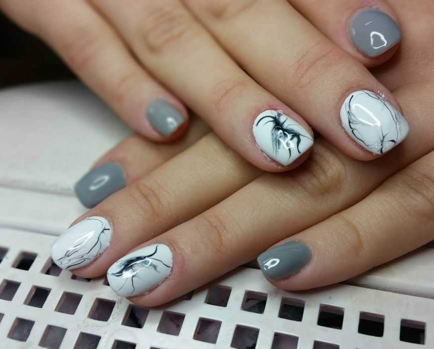 Без серого оттенка немыслим и модный мраморный дизайн, который также можно сочетать с серебряными пигментами. Более наглядно о последних модных тенденциях nail-арта расскажут фото с красивым оформлением серых ногтей.