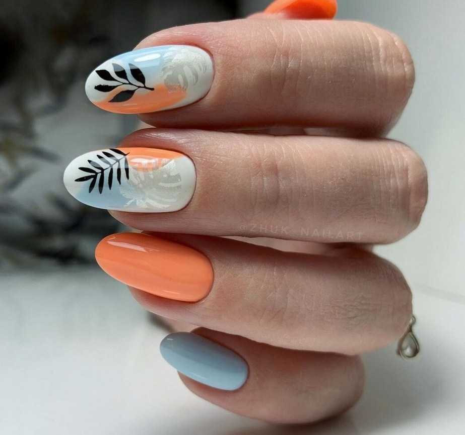 За основу для ногтевого дизайна можно взять не монохром, а модное цветовое сочетание, ведь оранж отлично комбинируется со многими оттенками палитры.