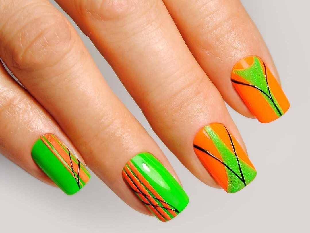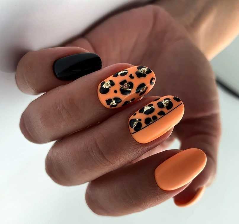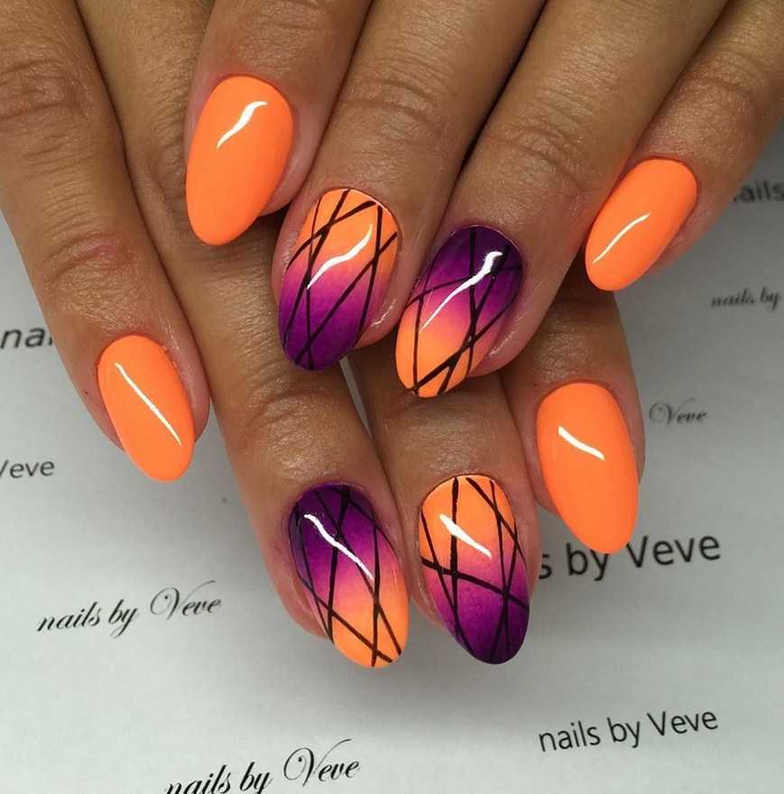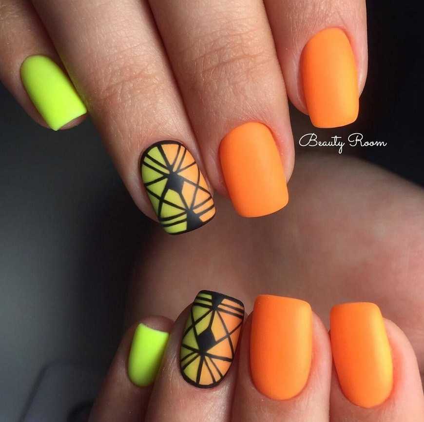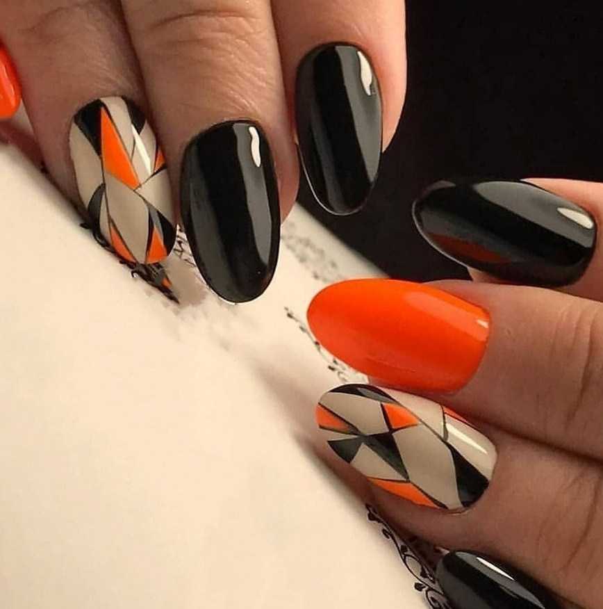 Такая цветовая гамма привлекает к себе внимание, поэтому важно позаботиться о том, чтобы кожа рук была в идеальном состоянии. Идеально выглядят ногти оранжевые с черным дизайном в сочетании с геометрическими принтами в одежде