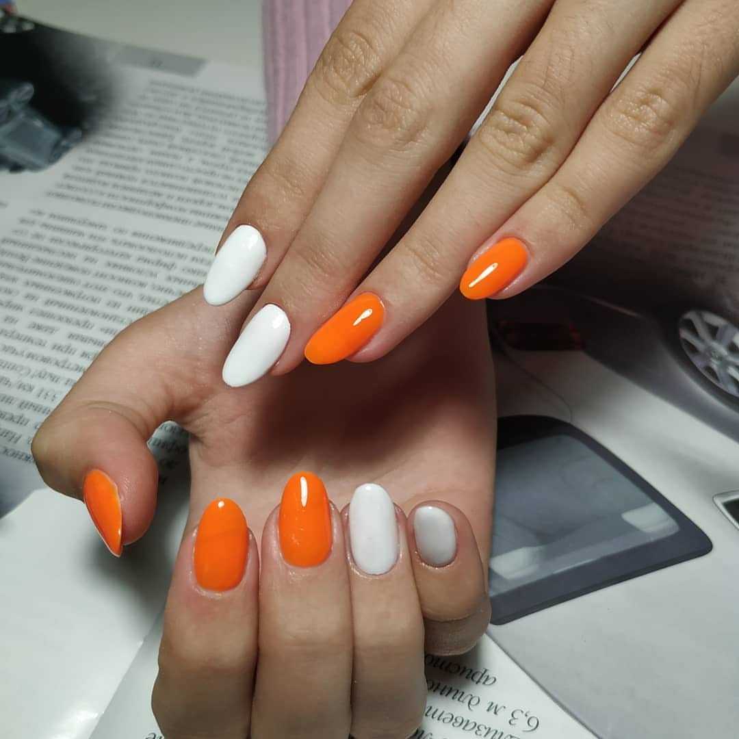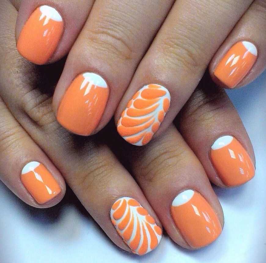 Один из цветов выступает в качестве базы, на которую наносится рисунок вторым оттенком. Интересен и вариант, когда несколько ногтей покрываются только оранжевым, а остальные – белым.