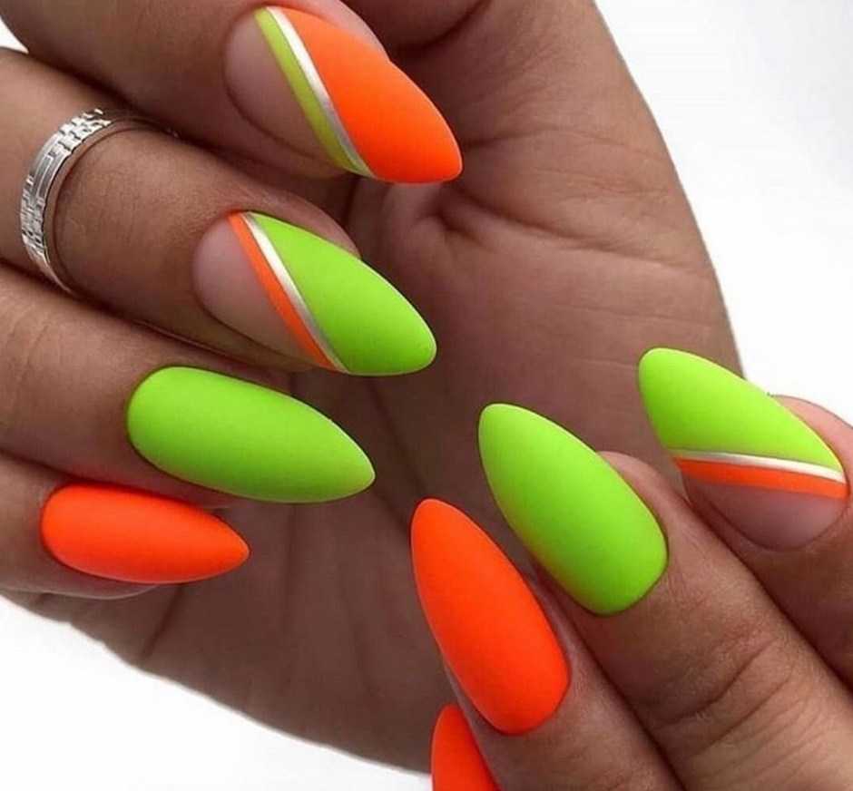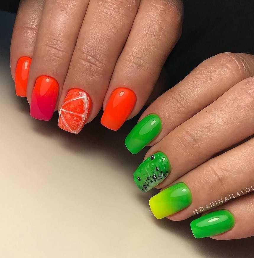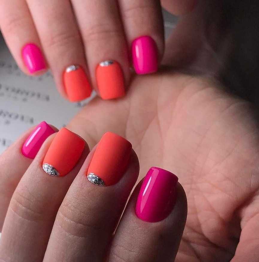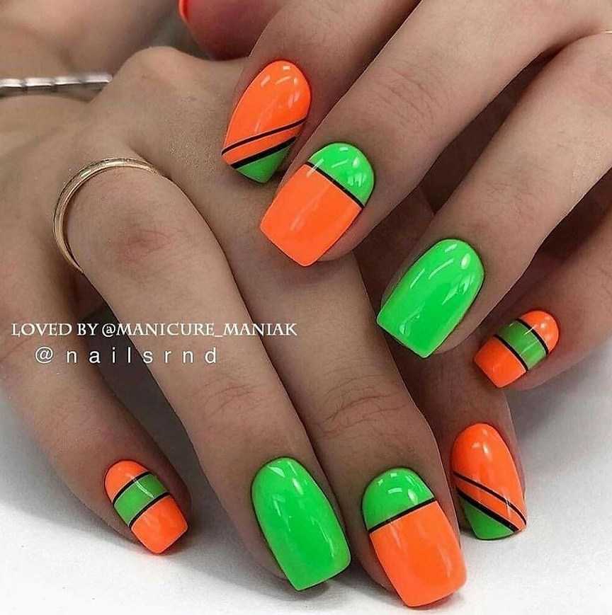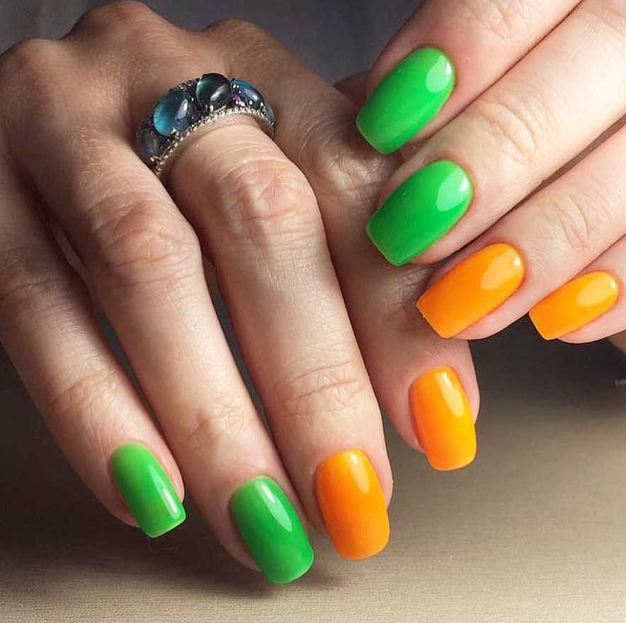 Дуэт выглядит действительно сочным, летним, будет хорошим дополнением к яркому образу. Он очень контрастный, а его оттенки можно брать в любых пропорциях. При желании, дополнить маникюр можно чёрным лаком.