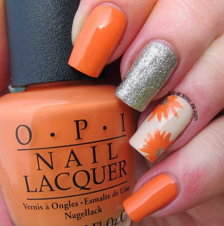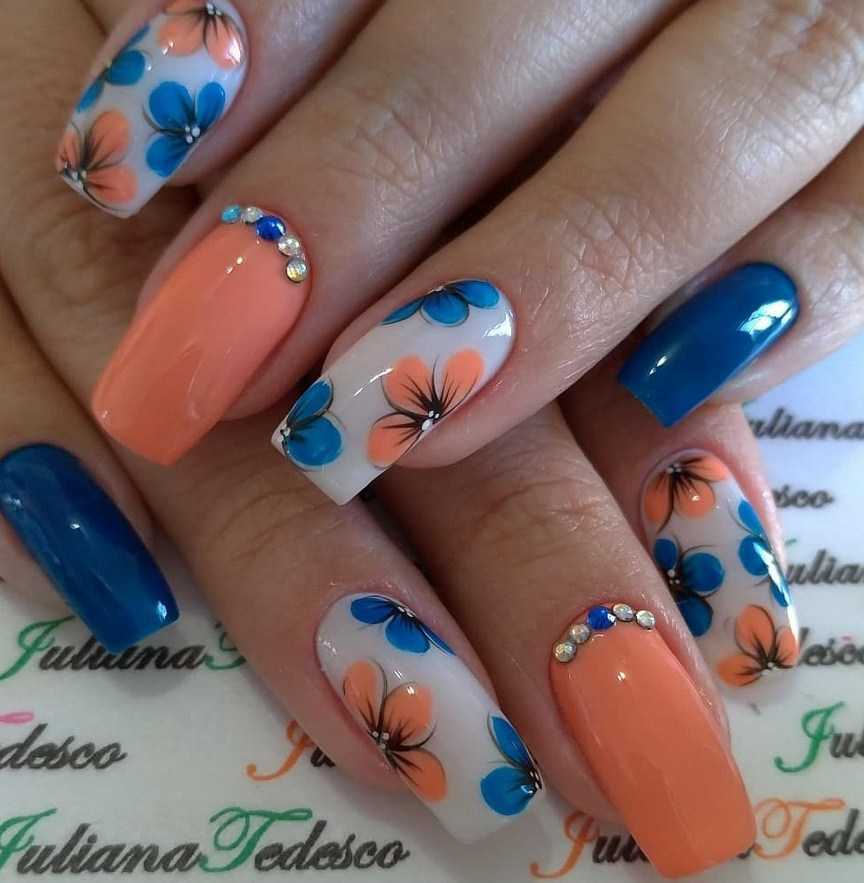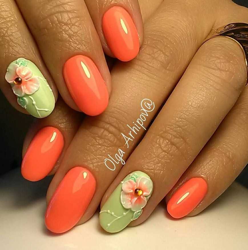 С цветочным принтом — хотя оранжевый тон считается доминирующем, он может быть эффектно облегчен сочетанием самой нежной и элегантной флористики. Объединив слайдер или художественный рисунок, вы получите женственный и красивый вариант маникюра.