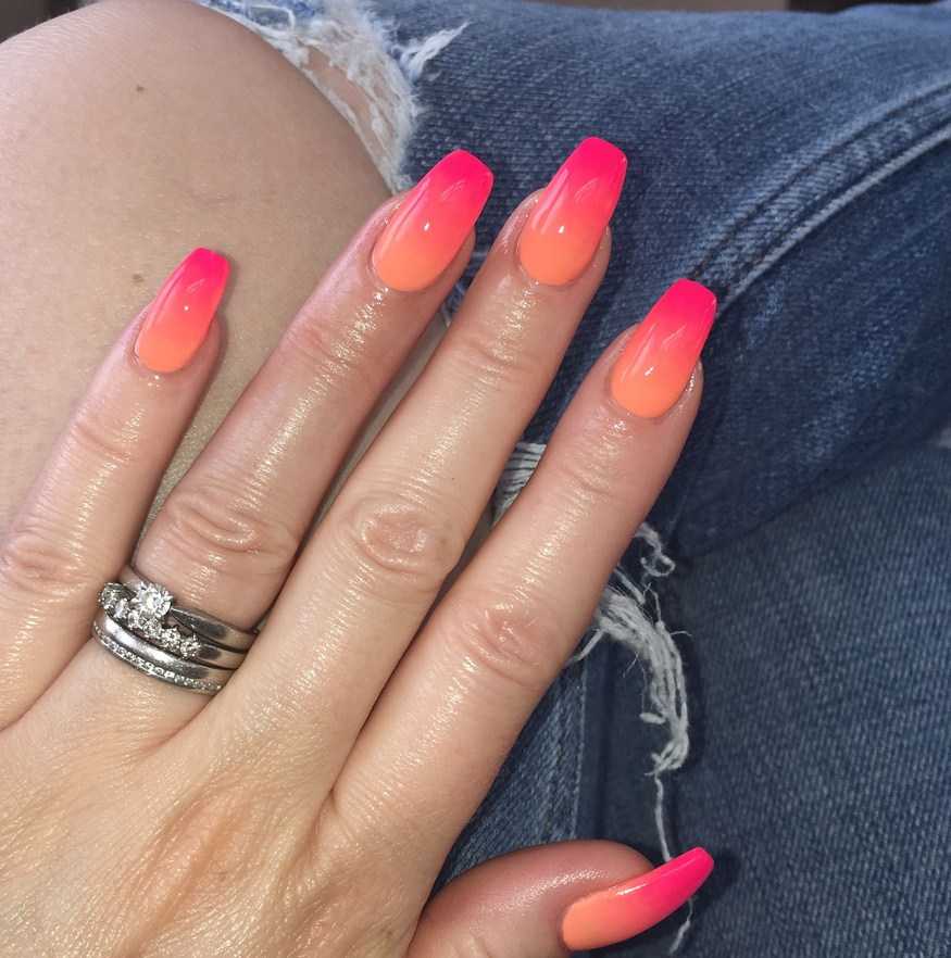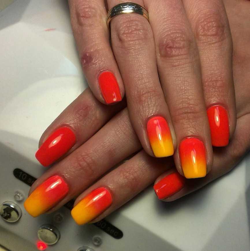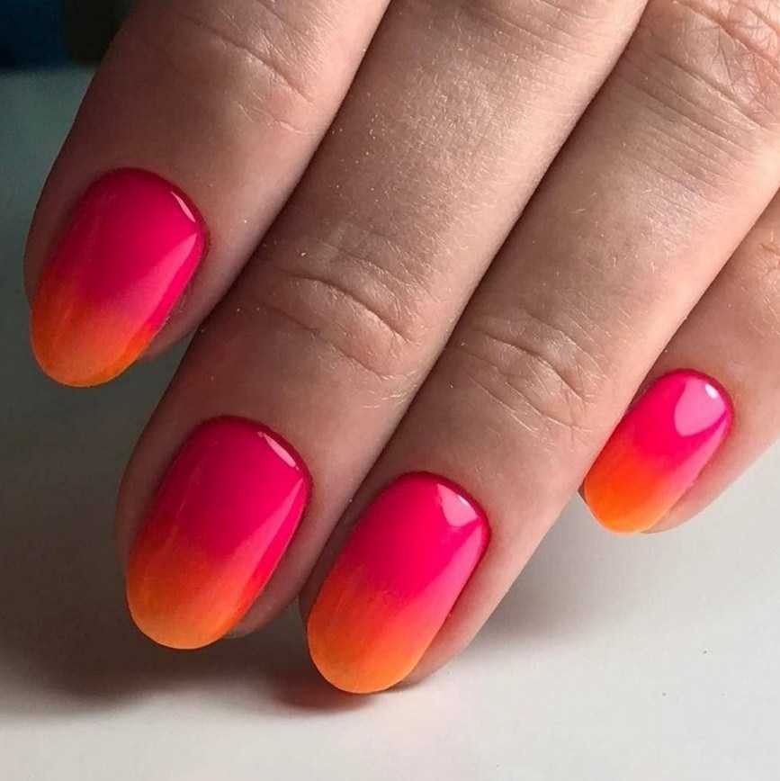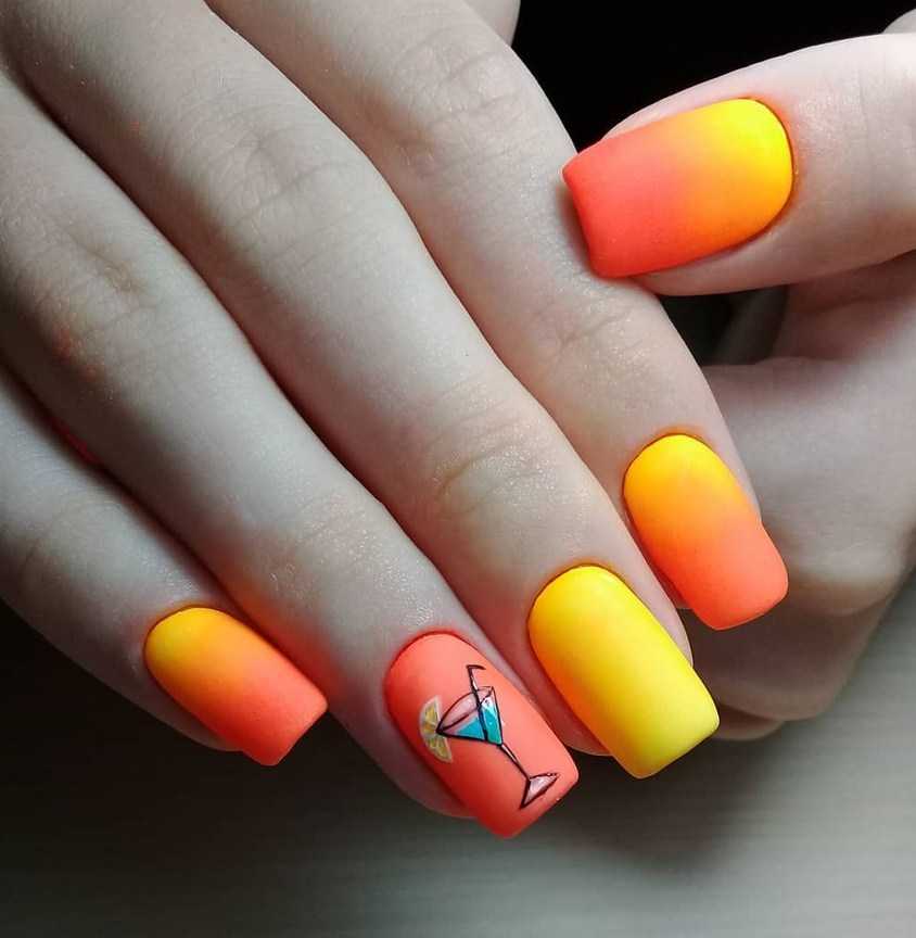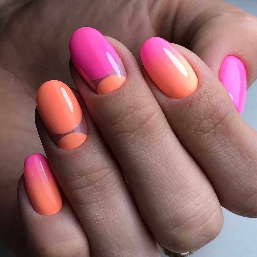 Стильно и жизнерадостно будет смотреться градиентный маникюр с плавным переходом от светлого, почти желтого оттенка к более темному оранжевому или насыщенному коралловому. Можно сделать градиент от пальчика к пальчику либо выполнить омбре на каждой ногтевой пластине.