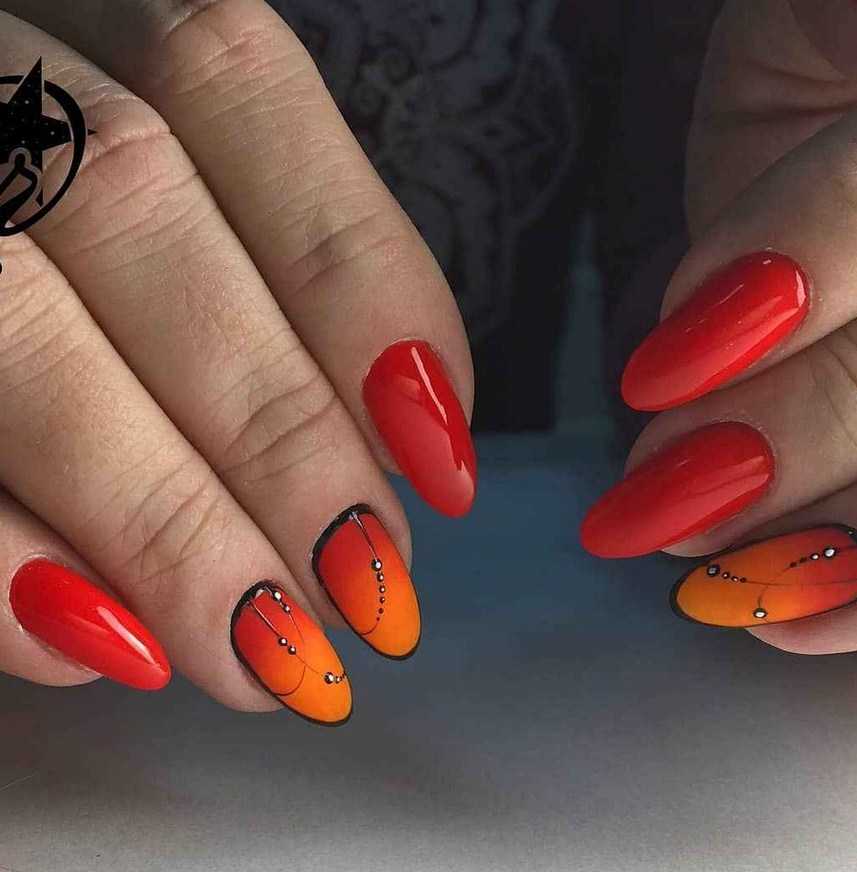 Маникюр с красными и оранжевыми оттенками в совокупности выглядит сочно и ярко. Для такого нестандартного дуэта лучше остановить выбор на чистом красном лаке и насыщенном апельсиновом оттенке. Используйте в оформлении таких цветовых решений технику омбре, различные красивые рисунки и геометрические мотивы, очерченные чёрным контуром.
