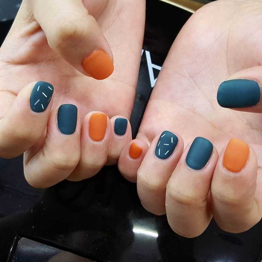 Оттенки близки по тональности, поэтому создают очень красивый, гармоничный нейл-образ. Также оранж можно комбинировать с вишнёвым, брусничным, бордовым, карамельно-красным.