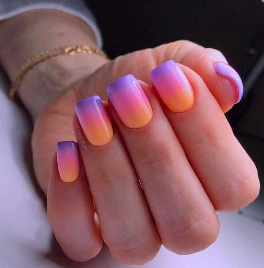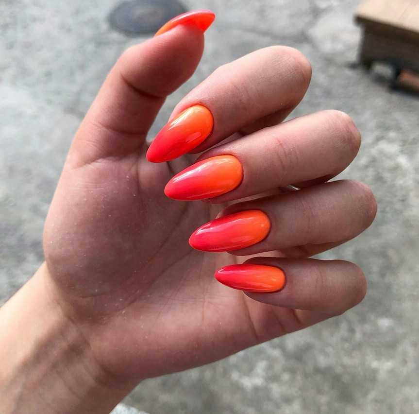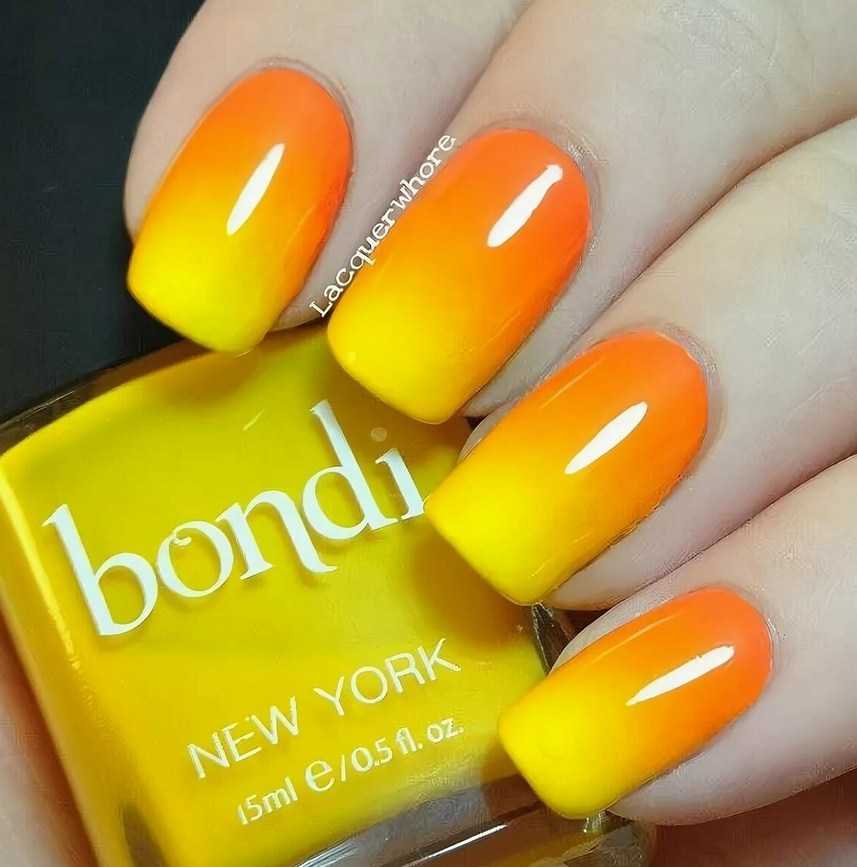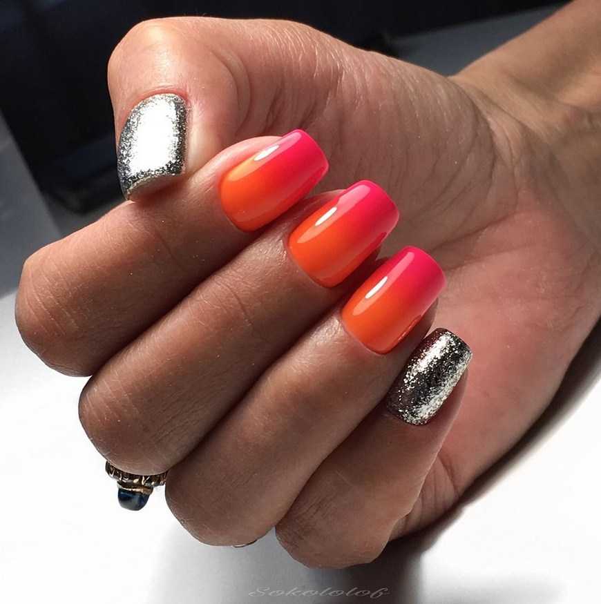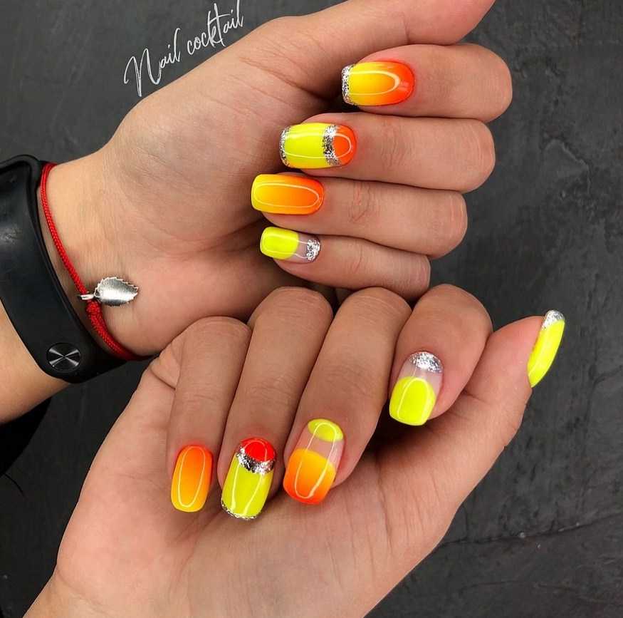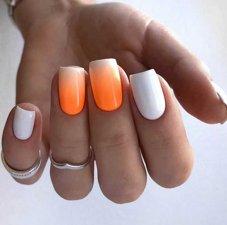 Цветовой градиент и в этом сезоне остается на вершине рейтинга популярности. Оранж сочетают с нейтральными белыми, серо-серебристыми и бежевыми тонами, персиковой и солнечно-желтой гаммой. Для этой техники применяют аэропуффинг или специальную кисть с бороздкой.