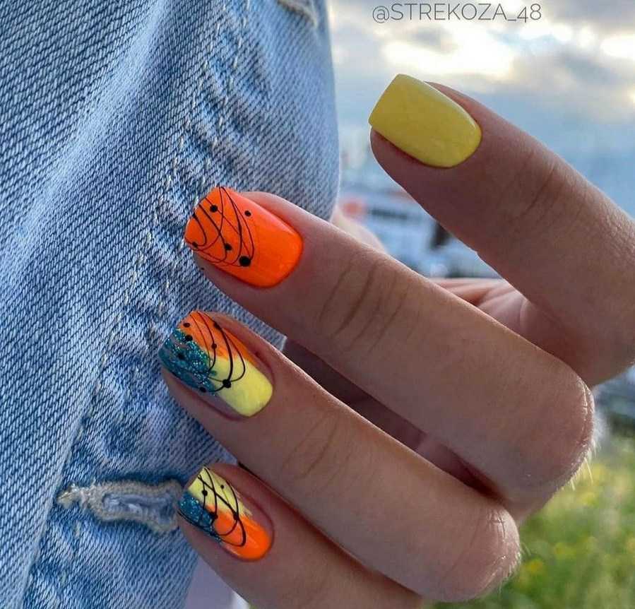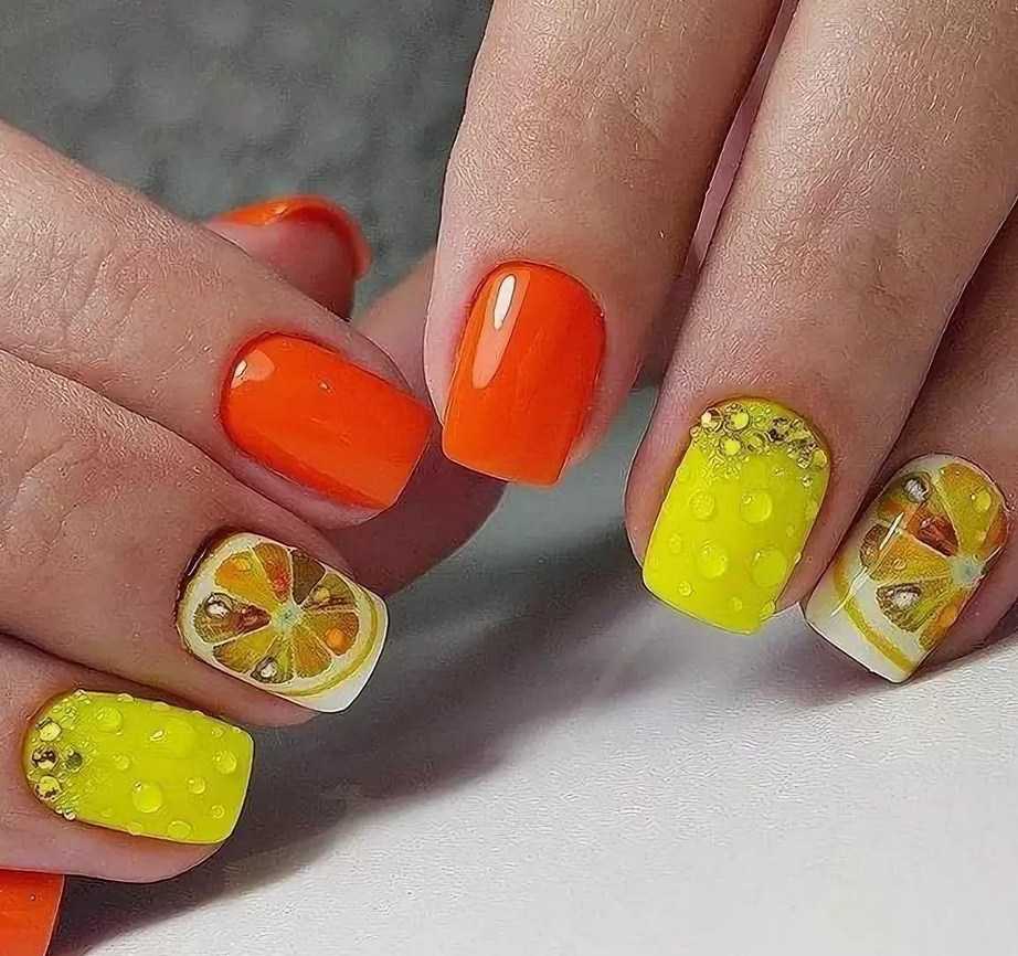 Среди модниц пользуется большой популярностью летний маникюр, при котором ногти на одной руке окрашены в морковный оттенок, а на второй – в сочный лимонный. Если дополнить дизайн меланжем на 2-3 ногтях, то это будет напоминать о сладком фруктовом мармеладе.